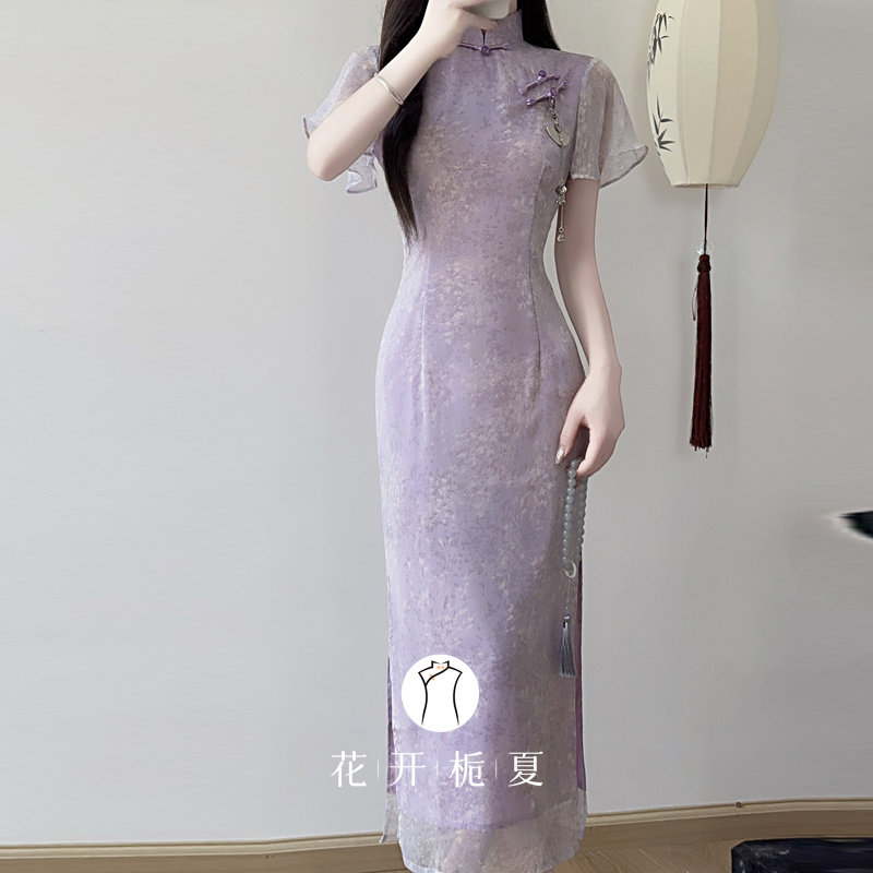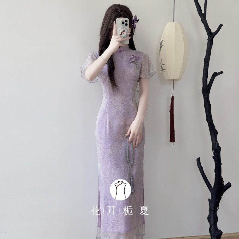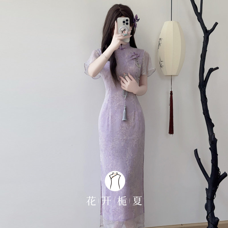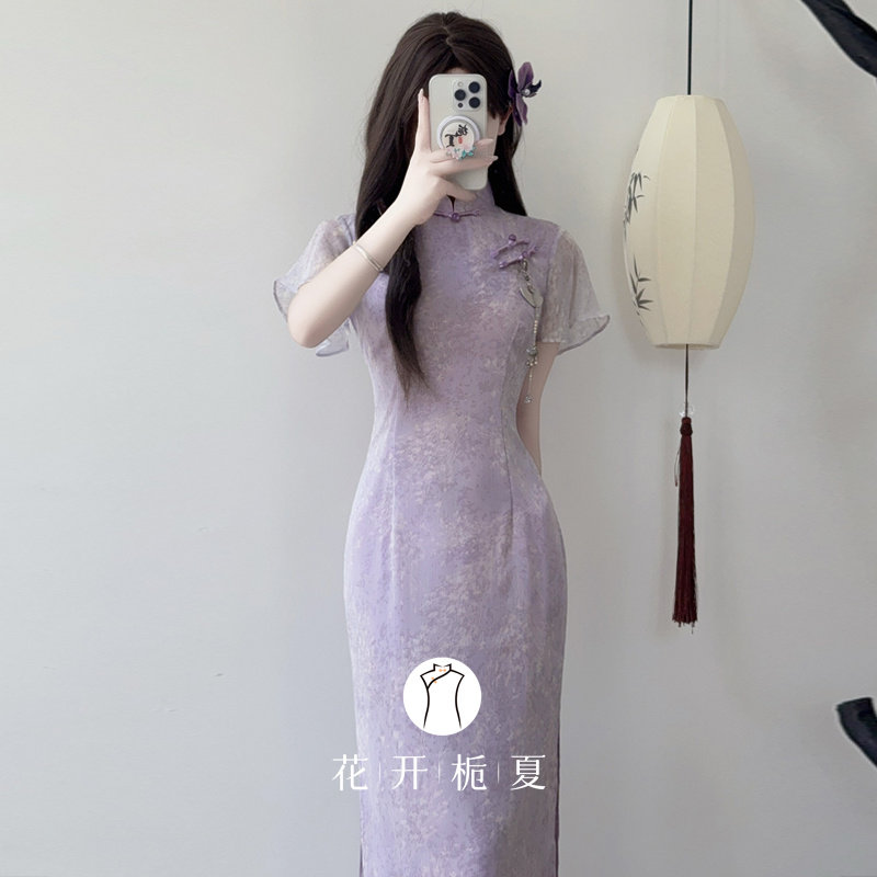 新款 旗袍2026夏季 紫色倒大袖 气质显瘦度假绝美长裙 紫嫣