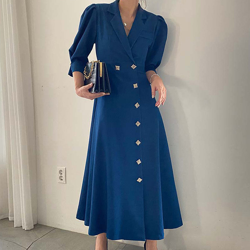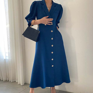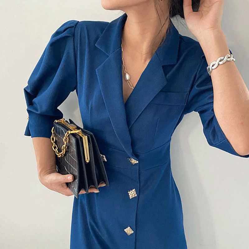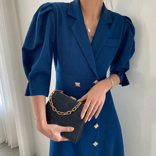 式 衬衫 连衣裙女 领别致单排扣收腰显瘦泡泡袖 韩国chic复古气质西装
