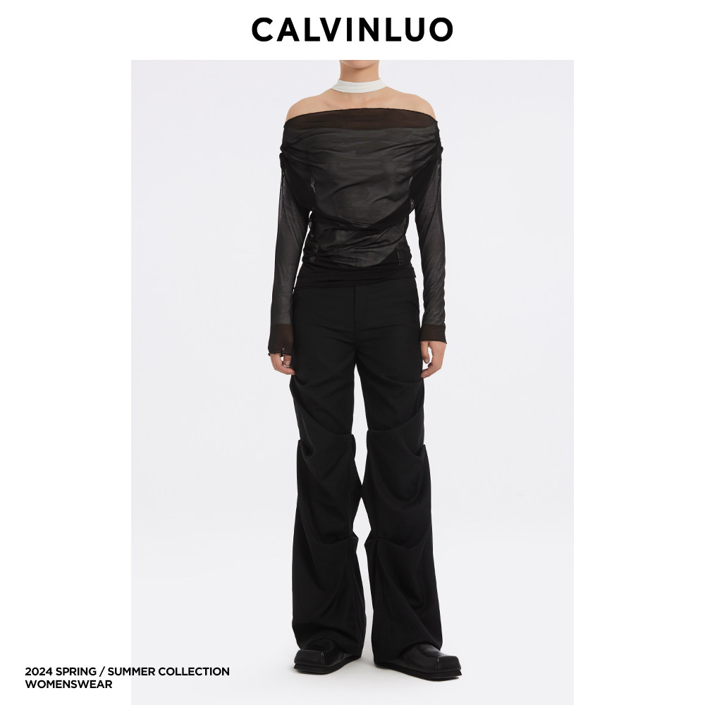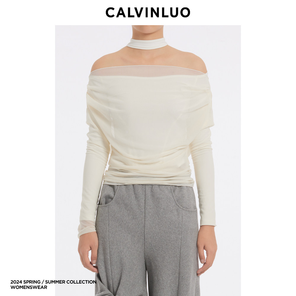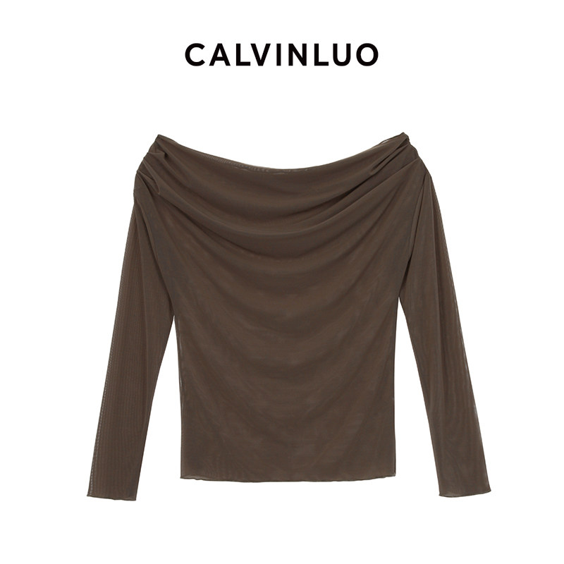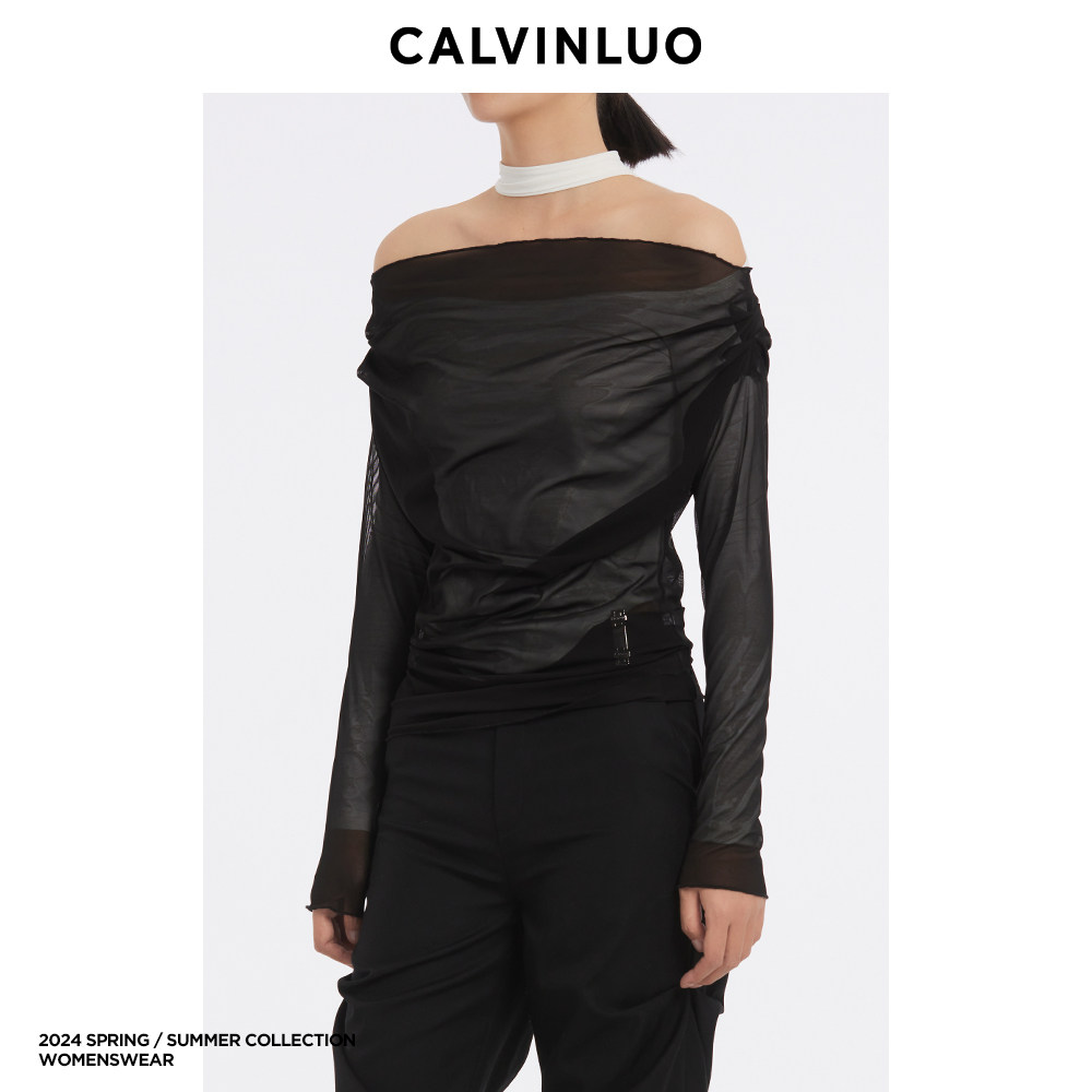 一字肩堆褶透视上衣 棕 24春夏 白 黑色 新品 CALVINLUO