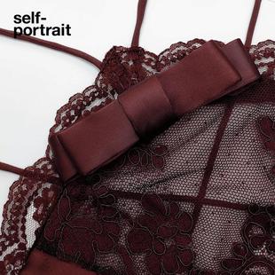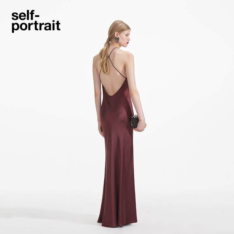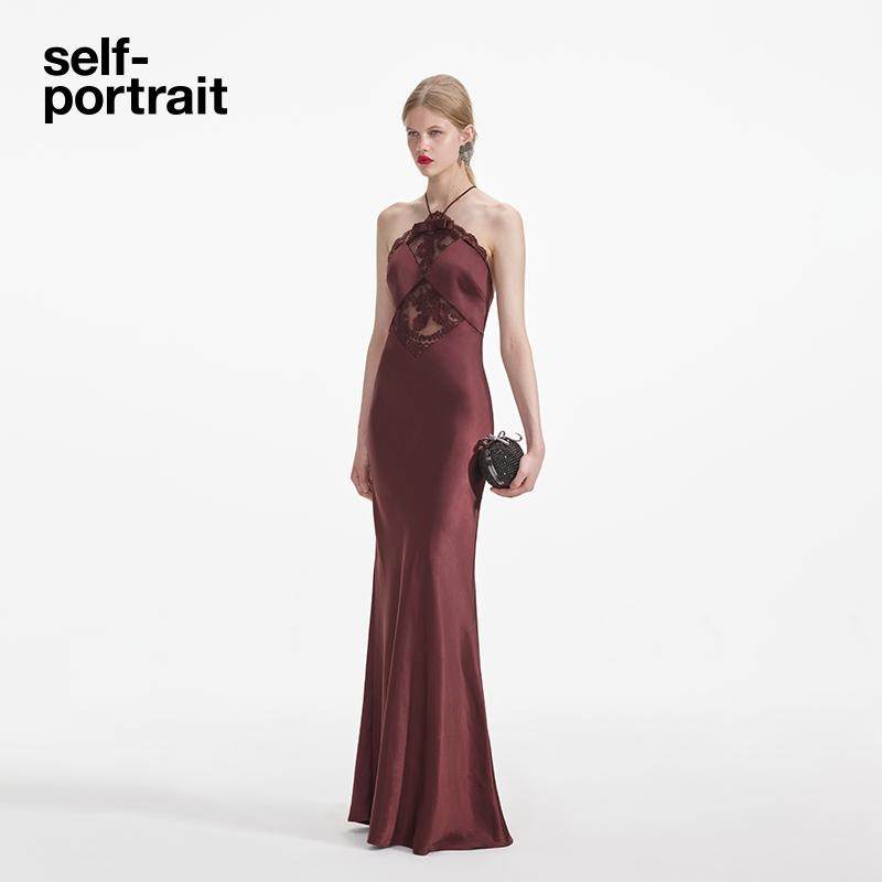 self 2025早春红棕色挂脖蕾丝拼接缎面礼服连衣裙 portrait