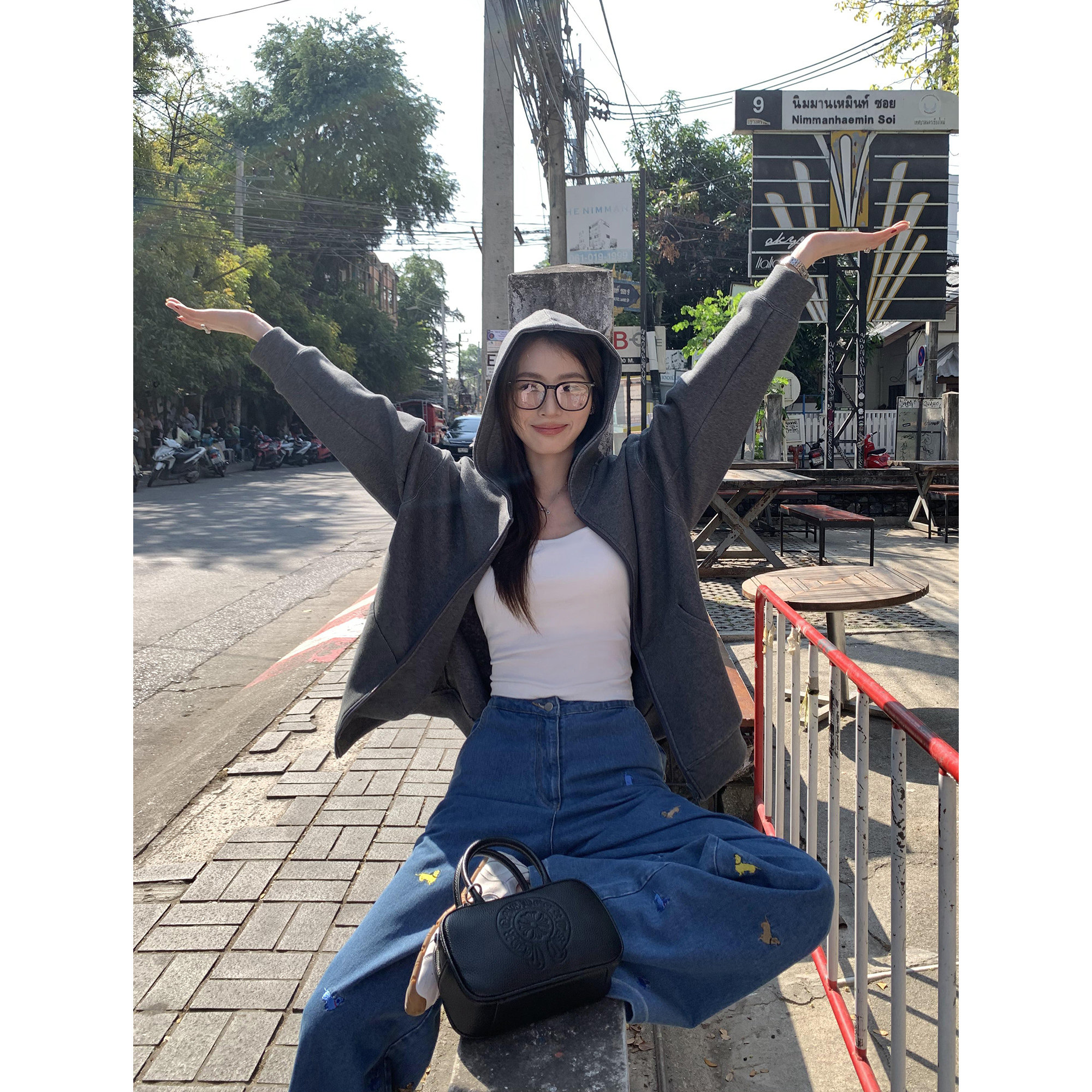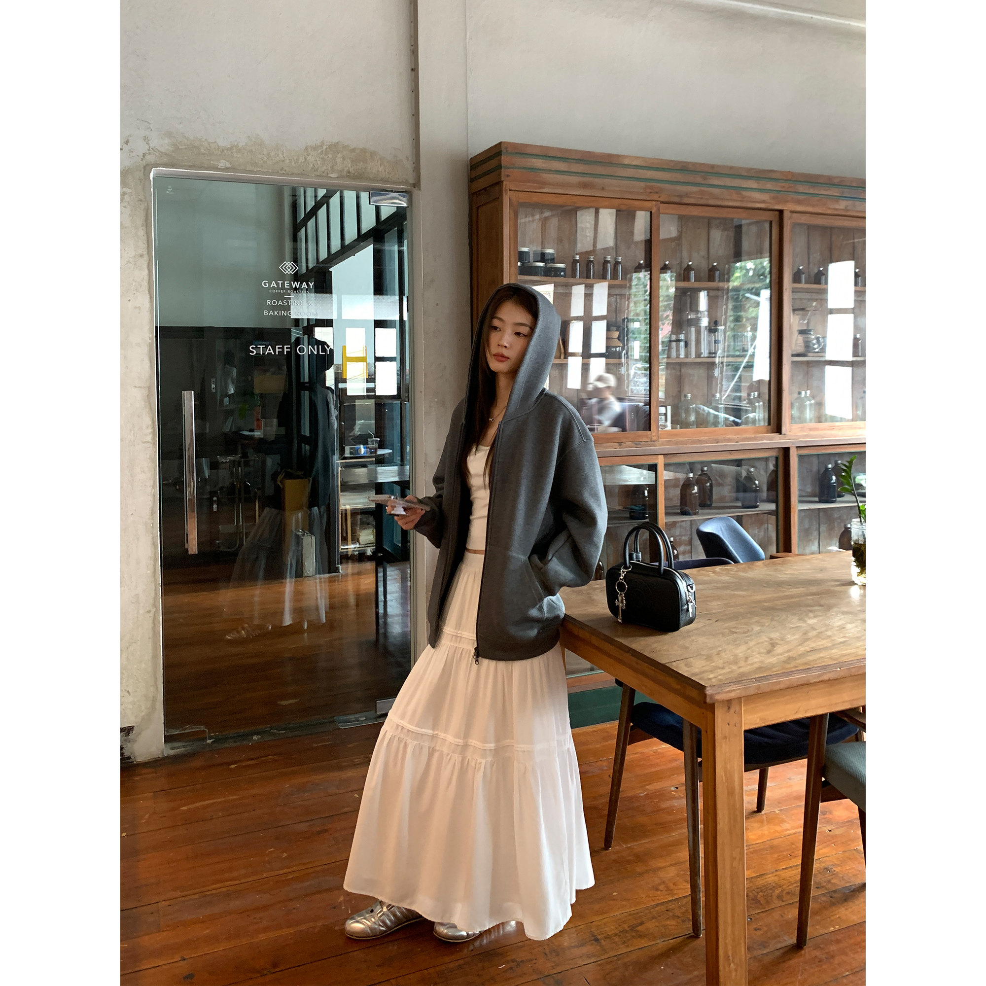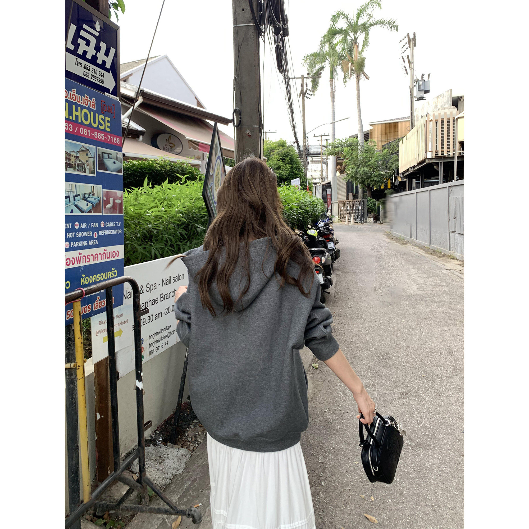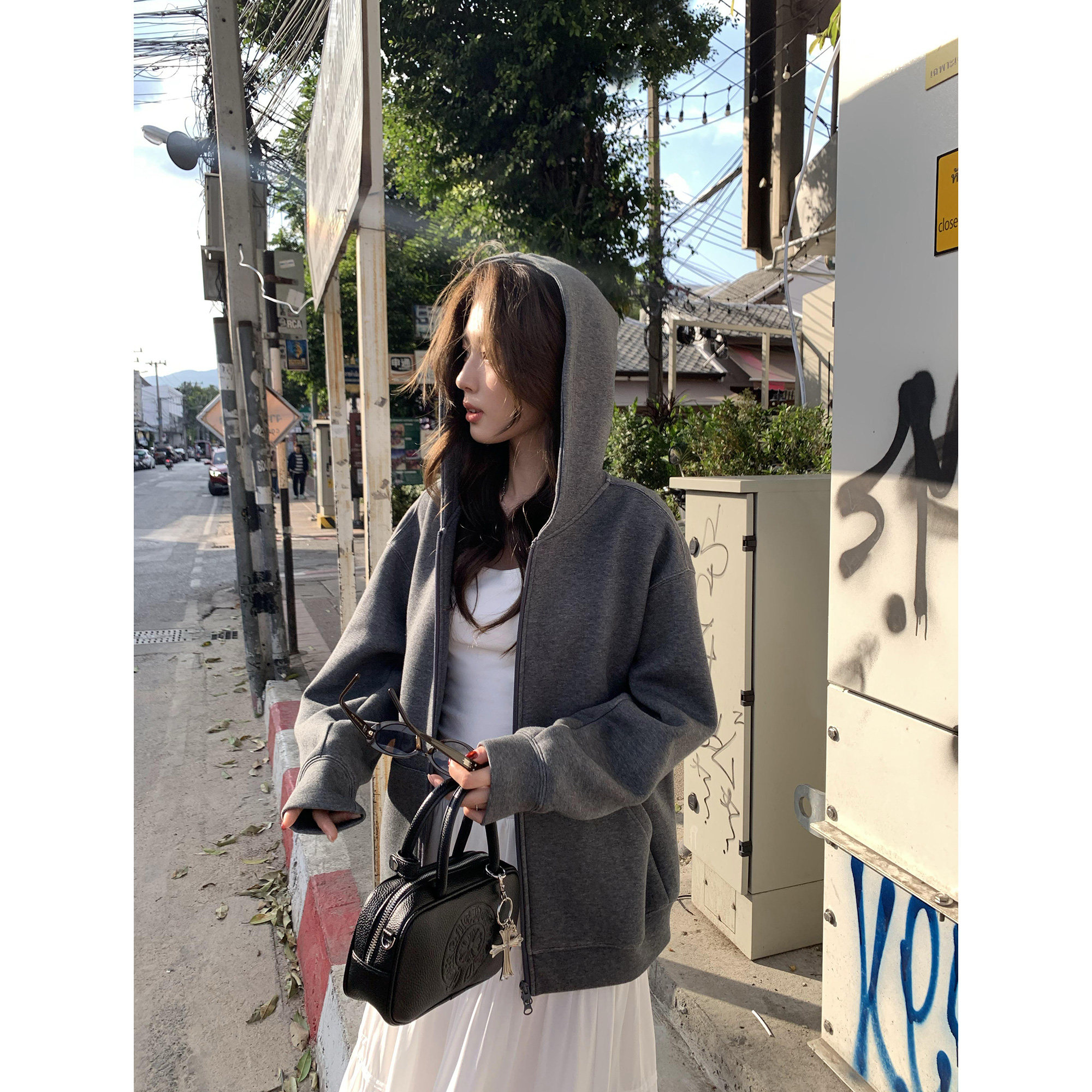 pusumede深花灰连帽卫衣女宽松大版 外套上衣 休闲慵懒风拉链开衫