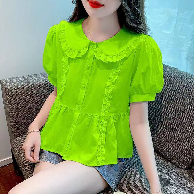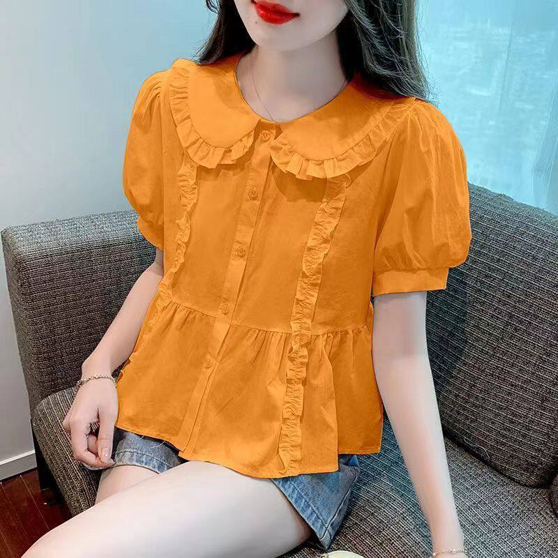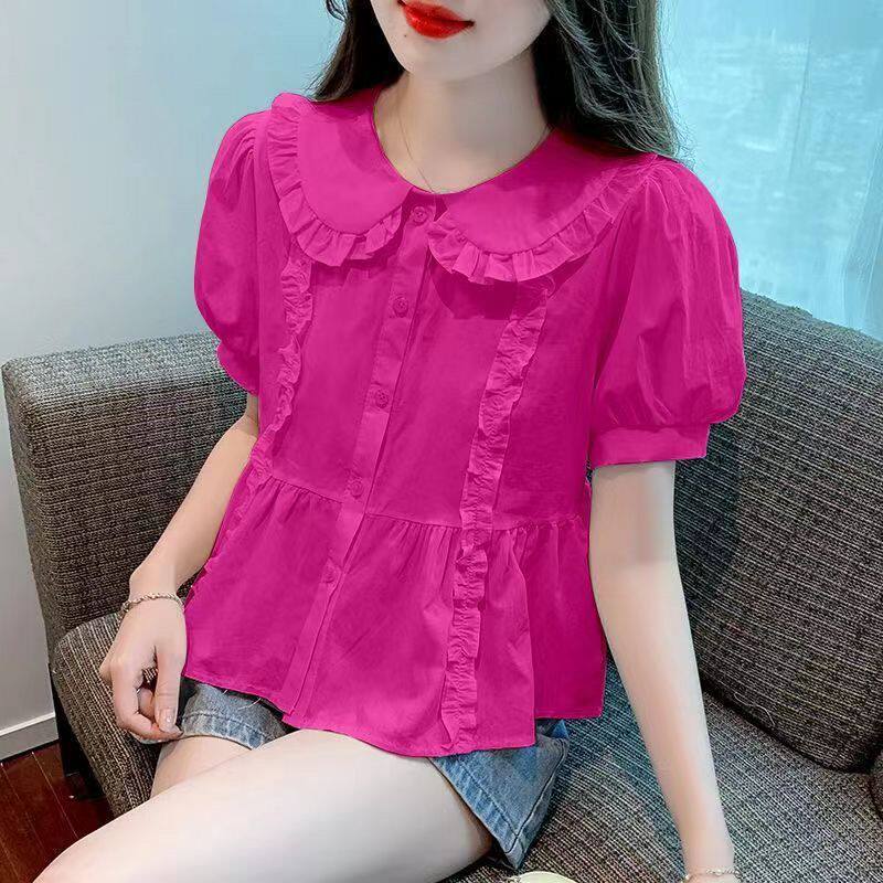 减龄法式 娃娃领短袖 遮肚子显瘦小衫 夏季 别致荷叶边女上衣 雪纺衬衫