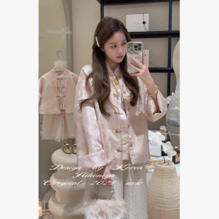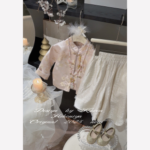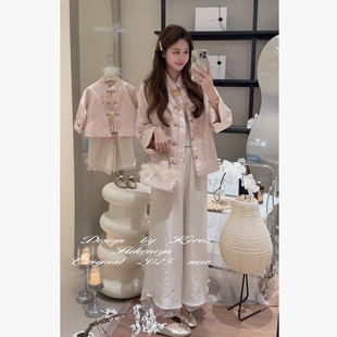 女童外套长裤 Spring韩国童装 套装 亲子粉色提花中式 两件套 2025春季