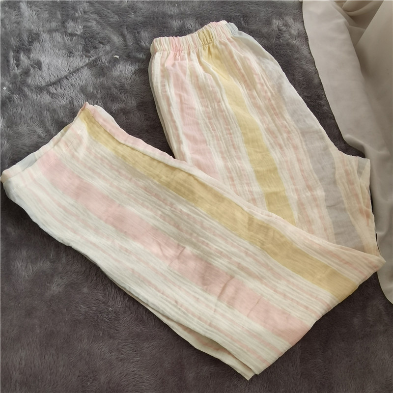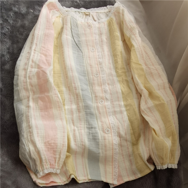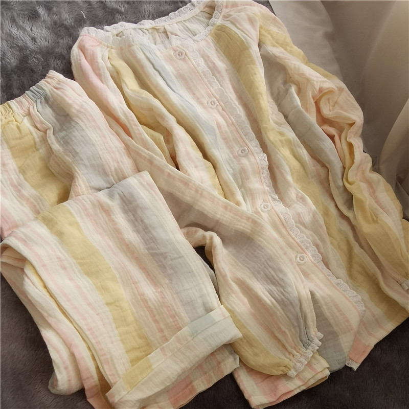 清新纯棉双层纱布睡衣花边粉蓝宽条女家居服套装 慵懒风绉布春夏
