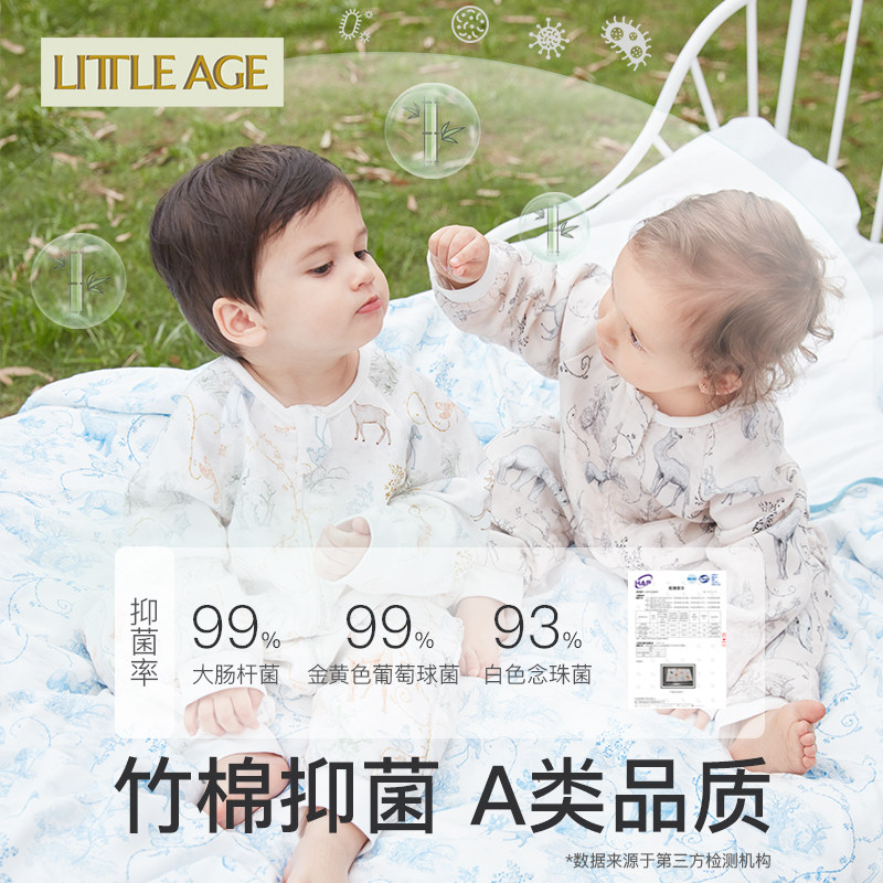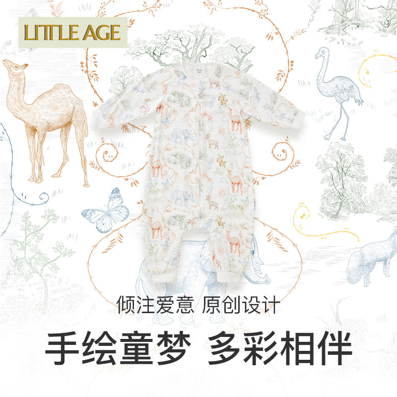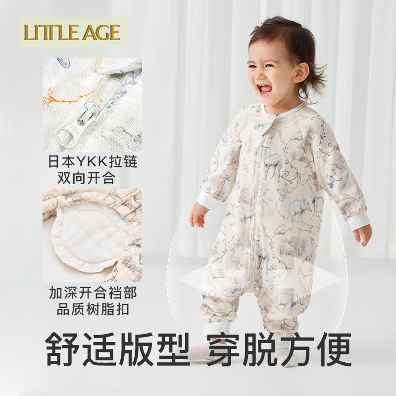 littleage婴儿睡袋春秋竹棉纱布短袖 儿童防踢被分腿四层宝宝睡袋