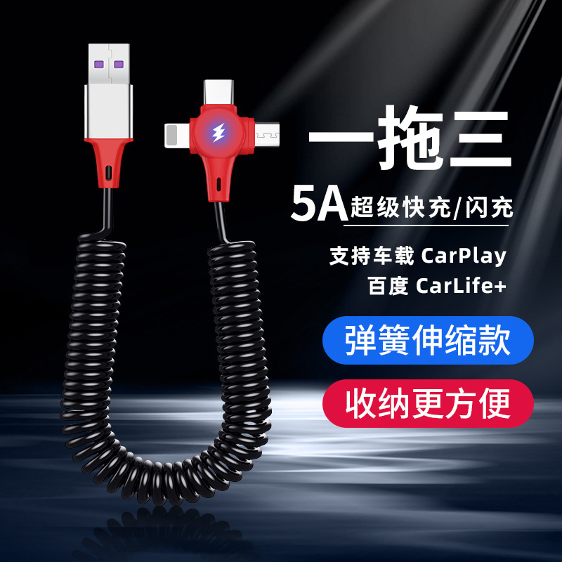 5A超级快充弹簧数据线适用华为mate40苹果11车载伸缩p20充电线iPhone8安卓oppoR17闪充小米type c一拖三车用X