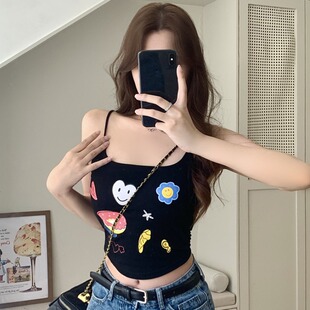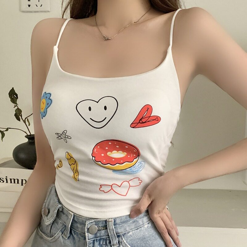 夏季 女装 带胸垫打底上衣 吊带小背心胖妹妹大码 纯欲风涂鸦印花短款