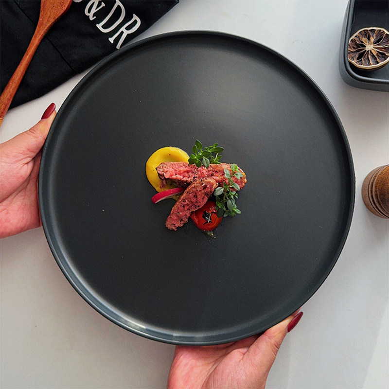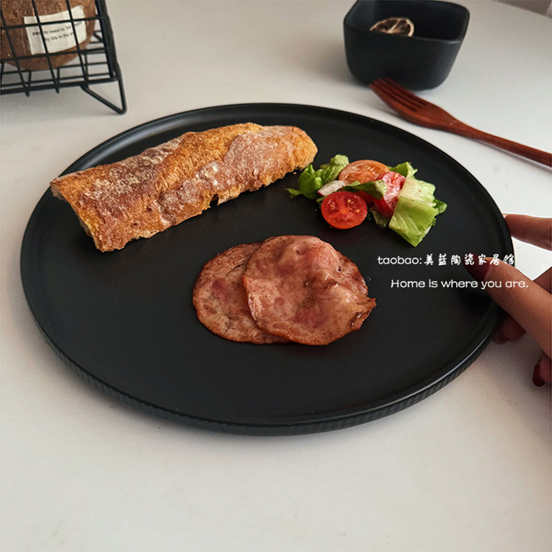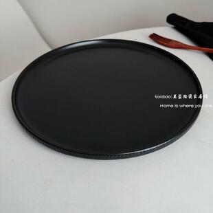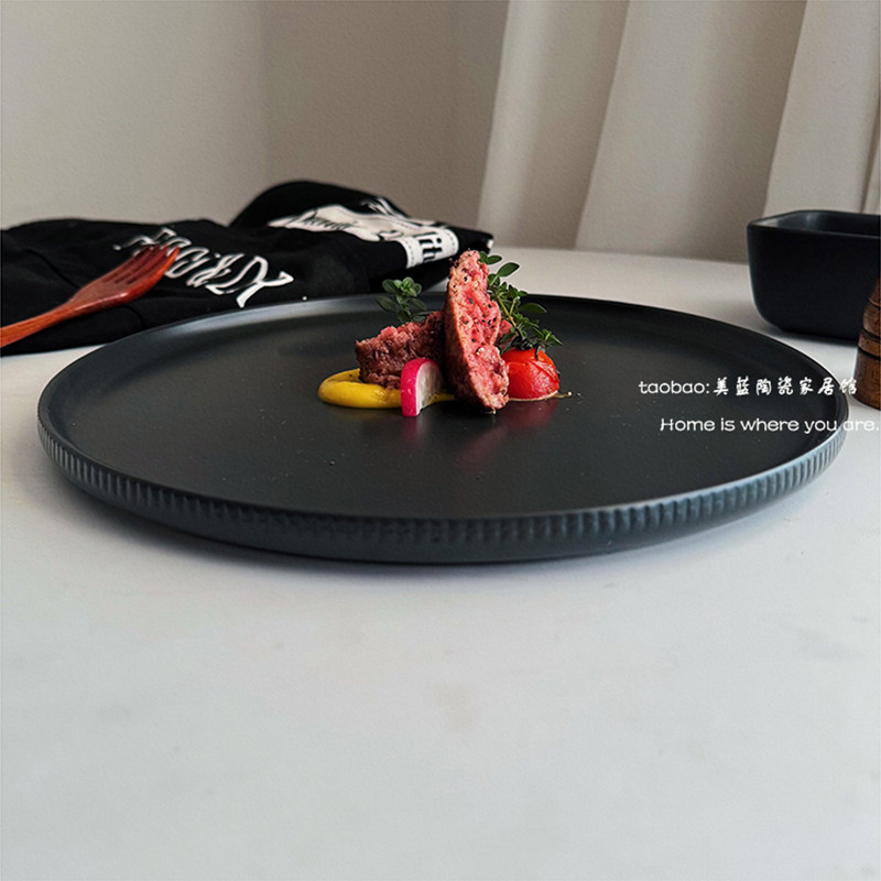 ins陶瓷餐厅西餐牛排盘沙拉盘瑕疵 超高级黑色竖纹哑光大平盘