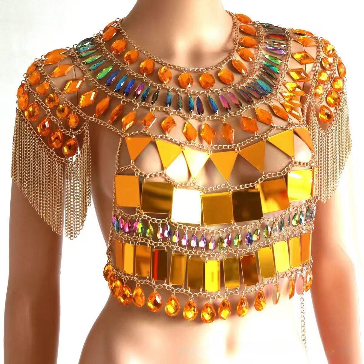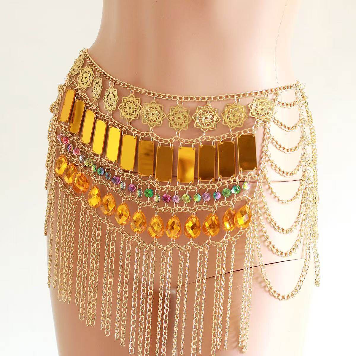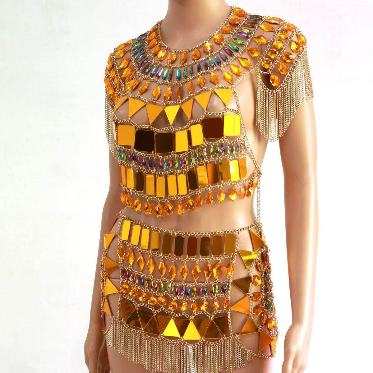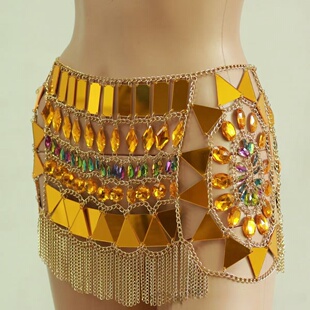 金色亚克力彩钻亮片身体链秀场流苏胸链套装 饰腰链女 印度肚皮舞装