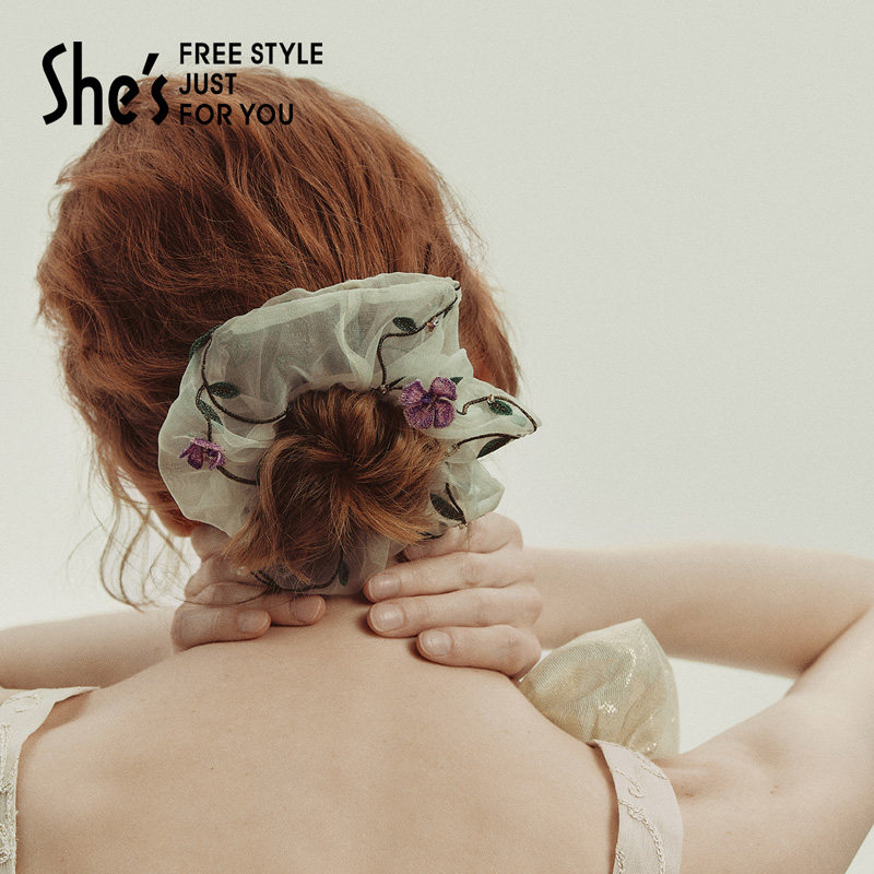 shes茜子卢梭假日手工刺绣花朵网纱大肠发圈欧根纱盘发头绳发饰女