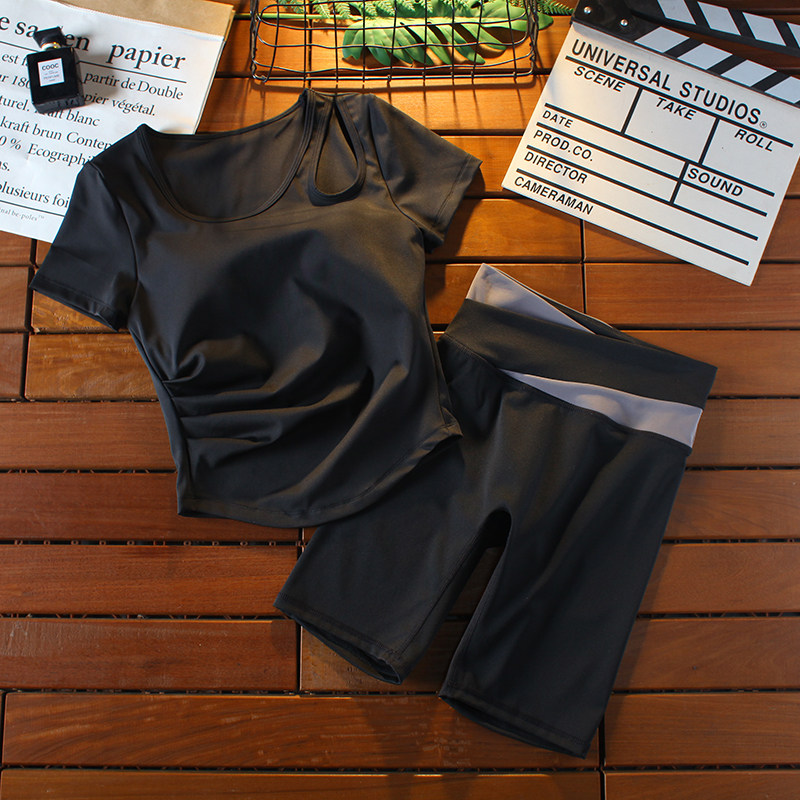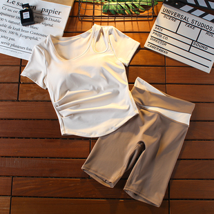 健身房运动速干跑步紧身侧边褶皱短袖 女高腰五分裤 瑜伽服套装 夏季