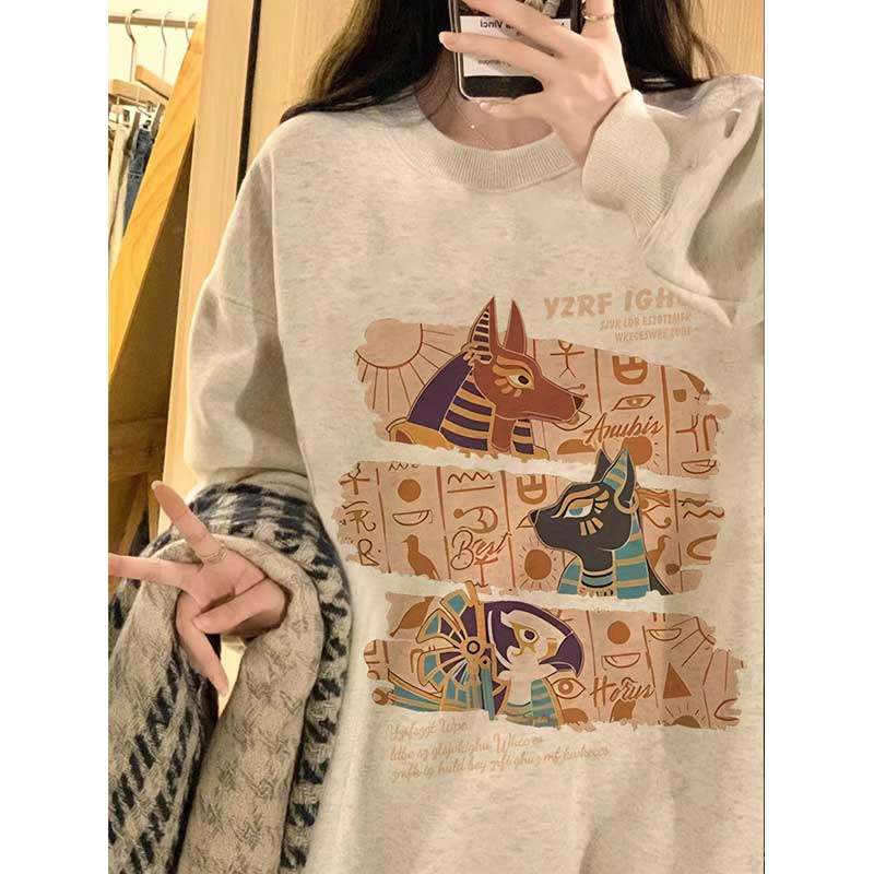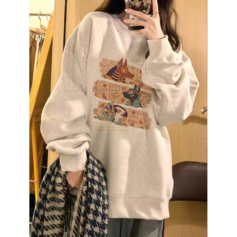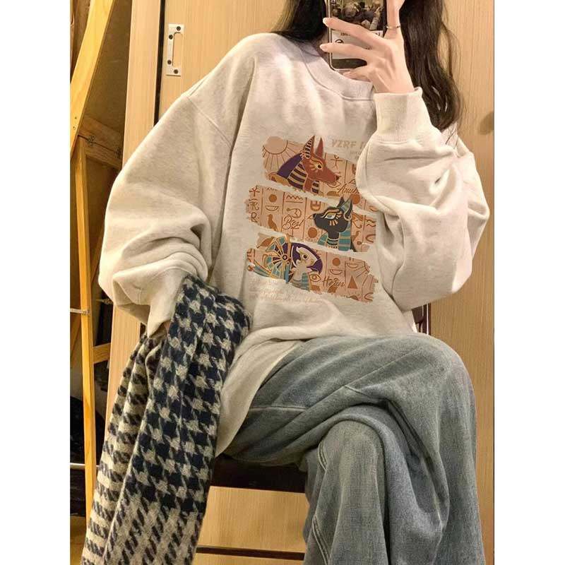 长袖 宽松春秋薄款 ins潮套头上衣 复古chic大码 圆领印花卫衣女美式