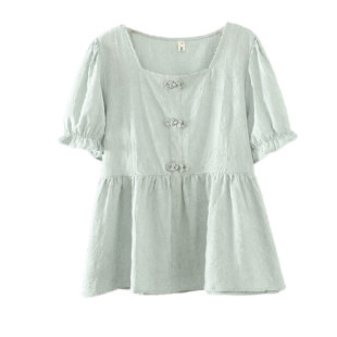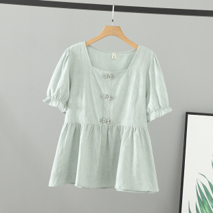 新款 国风盘扣短袖 女装 200斤T恤女盐系大码 上衣 方领娃娃衫 胖mm夏装