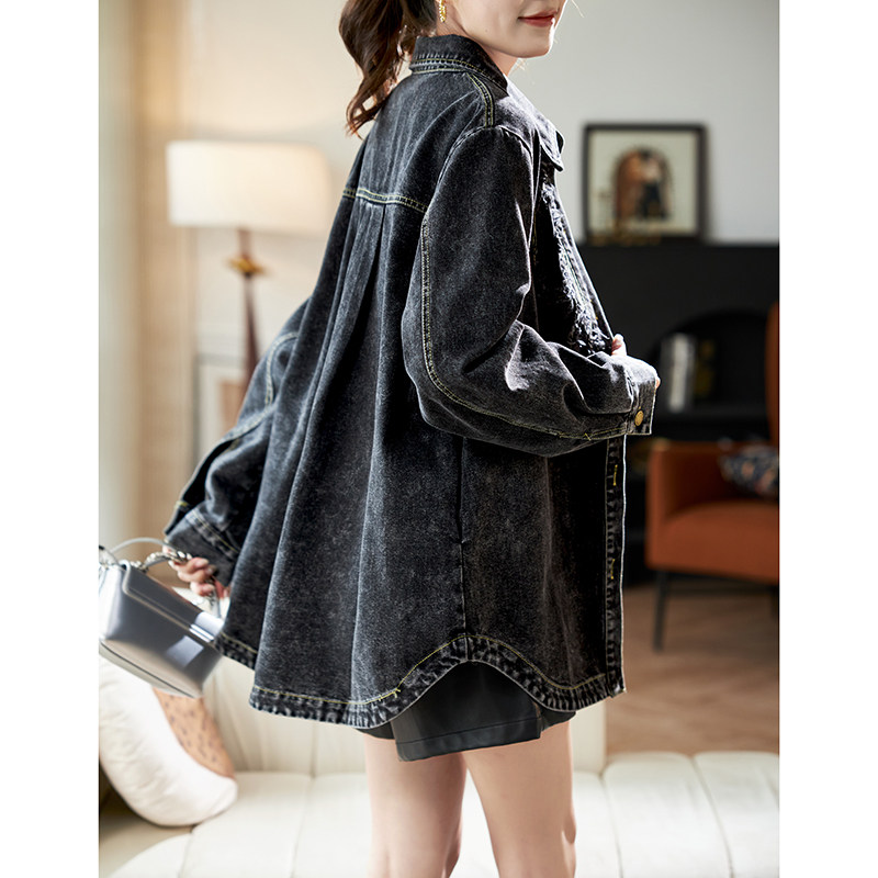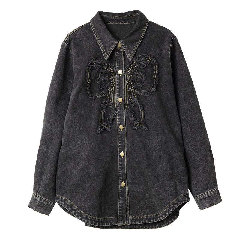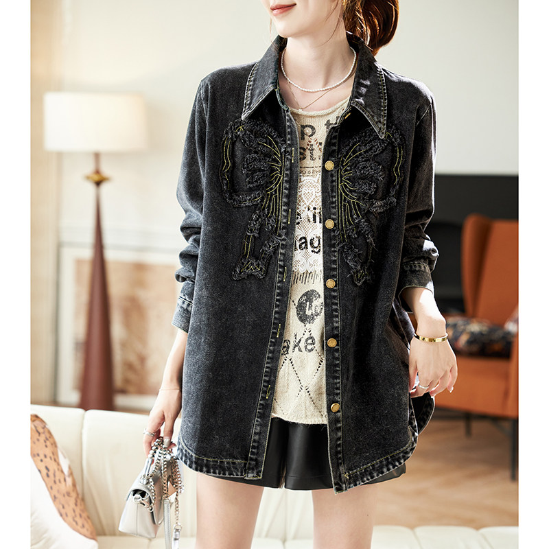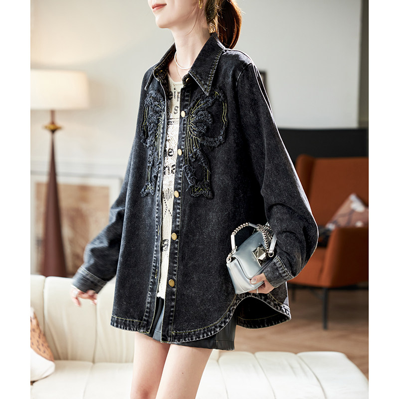 衬衣女 宽松休闲棉质长袖 宝诗黎中长款 刺绣做旧牛仔外套2026春季