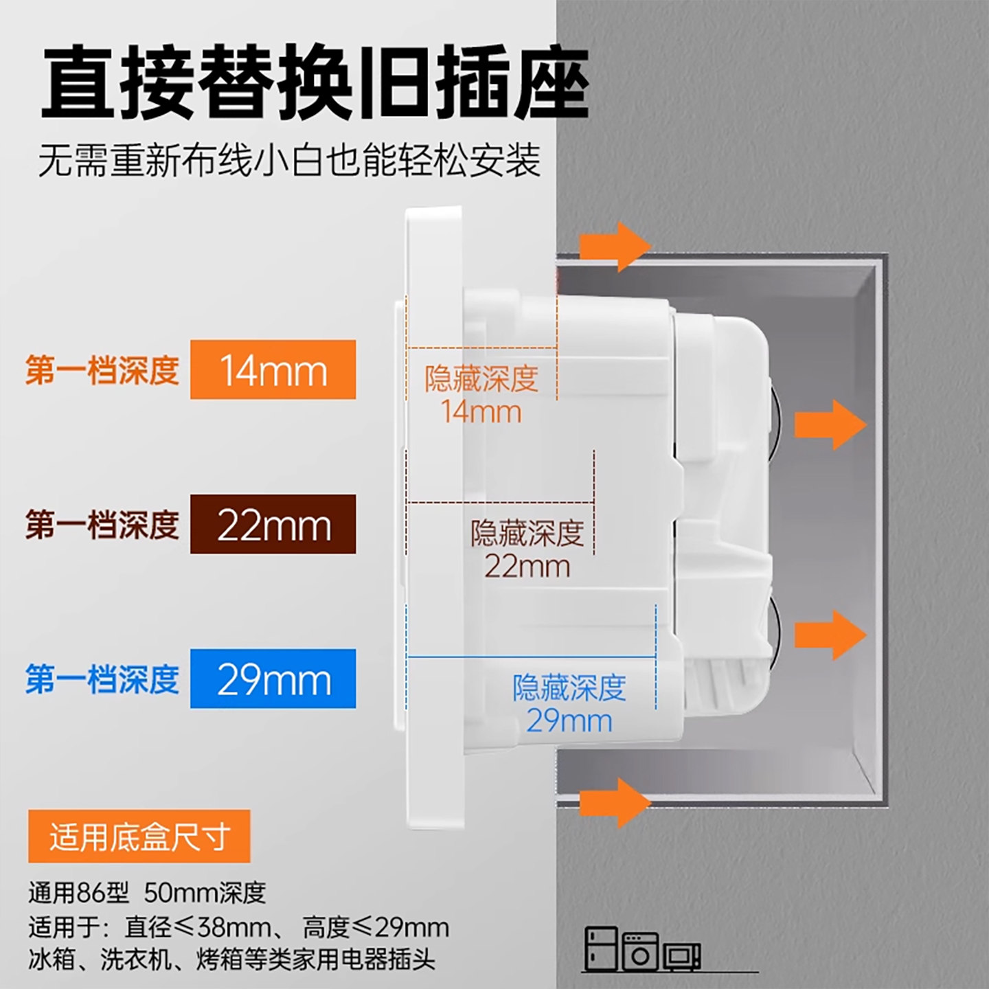 插座墙壁五孔 内凹内嵌式 86型隐形插座嵌入式 面板冰箱专用隐藏式