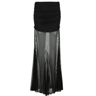显瘦拖地长裙 黑色透视网纱拼接缩褶半裙修身 ROCKMORE 性感御姐