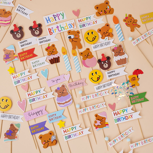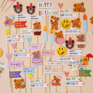 韩式 饰插件小熊蜡烛甜品插牌横幅 复古笑脸多色简易百搭生日蛋糕装