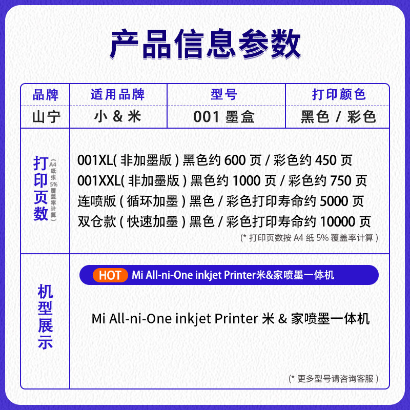 山宁适用小米001墨盒MI米家打印机墨盒喷墨打印一体机可加墨连喷家用办公学习作业扫描复印件黑彩色配件