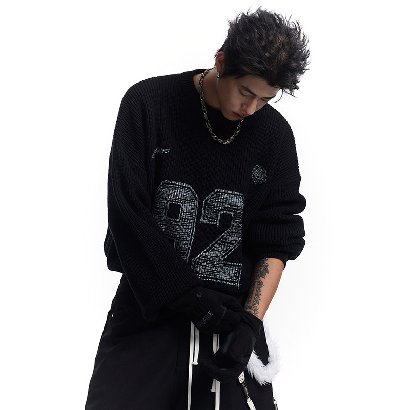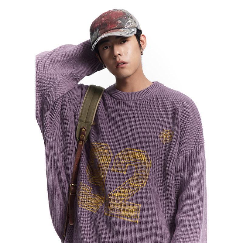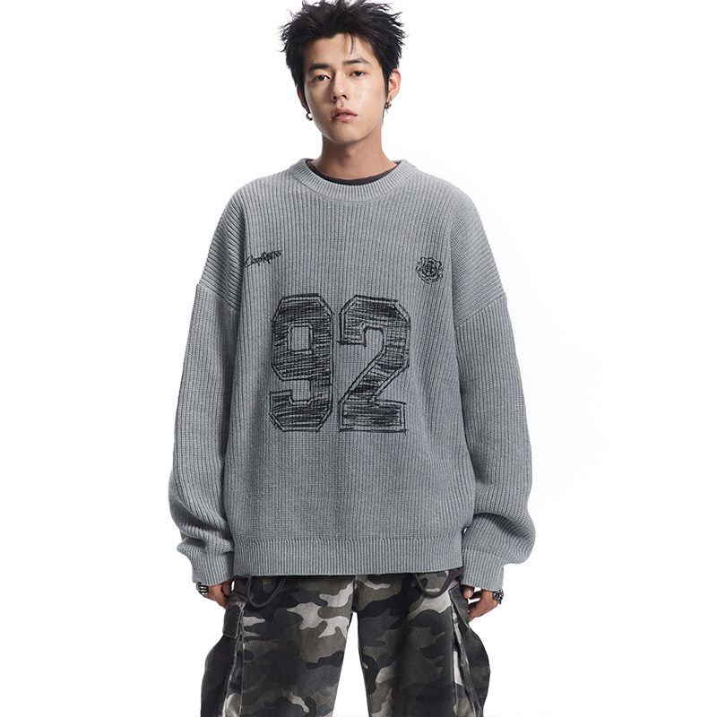 CoosRetro美式 数字胶印毛衣春秋男女宽松外套 复古圆领套头针织衫