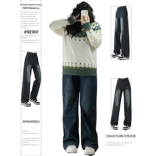 子宽松显瘦直筒女裤 胖mm大码 女秋冬保暖裤 复古水洗加绒牛仔裤 女装