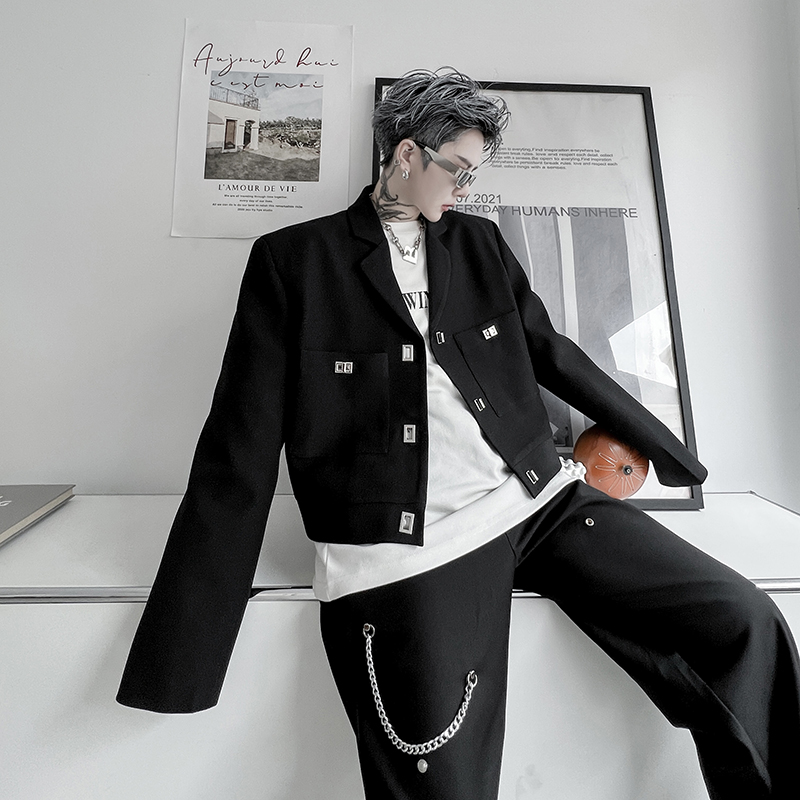 高级感黑色满天星西装 流行链条小西服上衣 外套男垫肩帅气百搭韩版