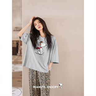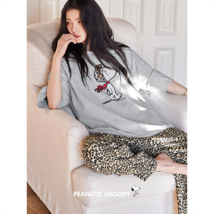 套装 贝妍史努比睡衣女士夏季 豹纹长裤 短袖 慵懒宽松凉感家居服 薄款