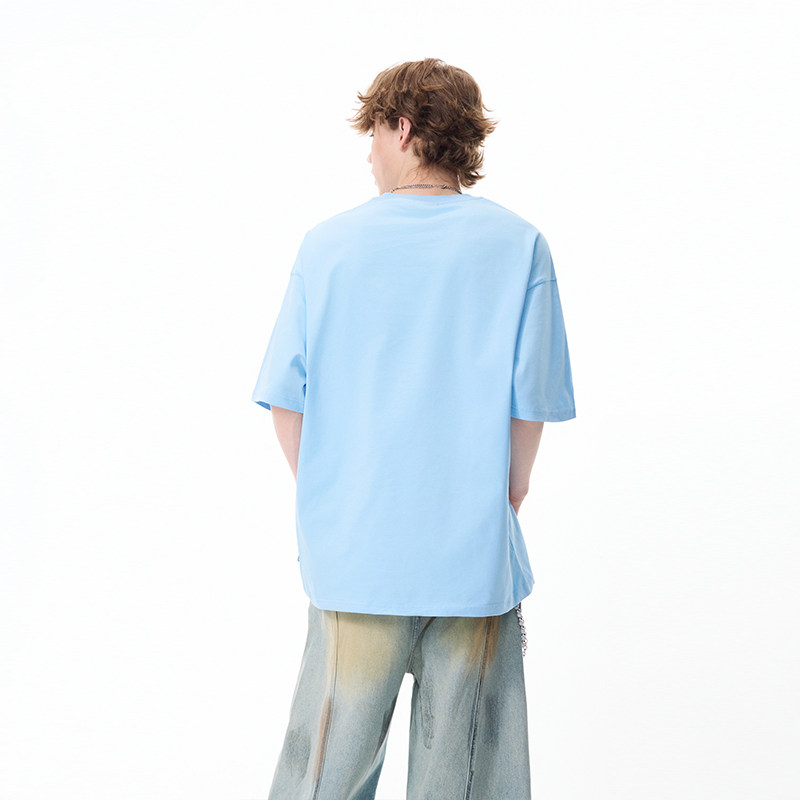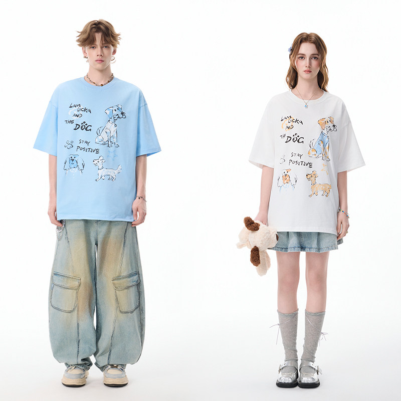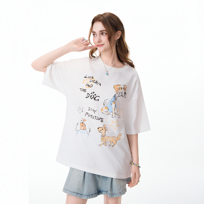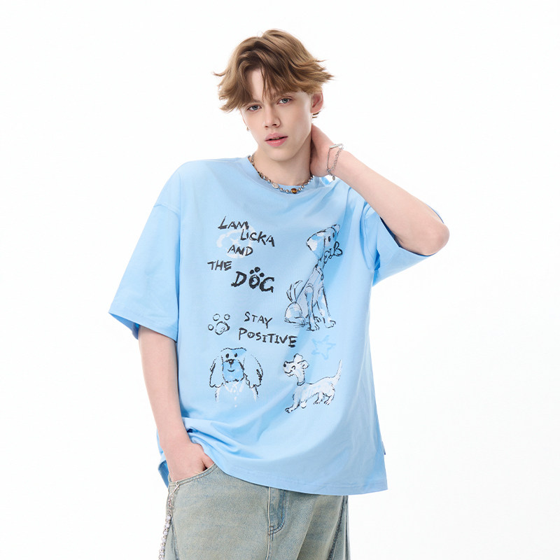 LAMLICKA涂鸦小狗短袖 潮牌纯棉白色宽松休闲慵懒风上衣 t恤男夏季