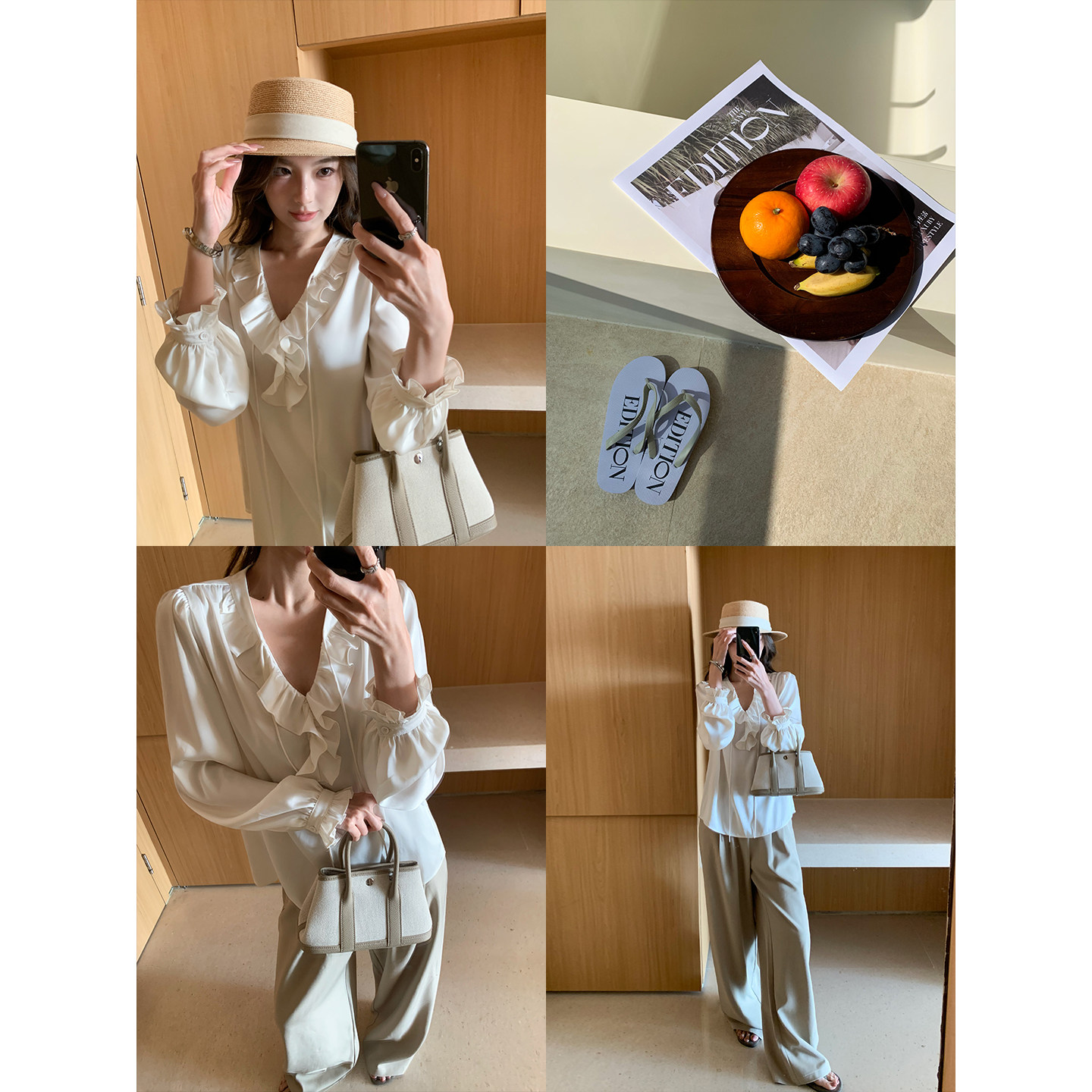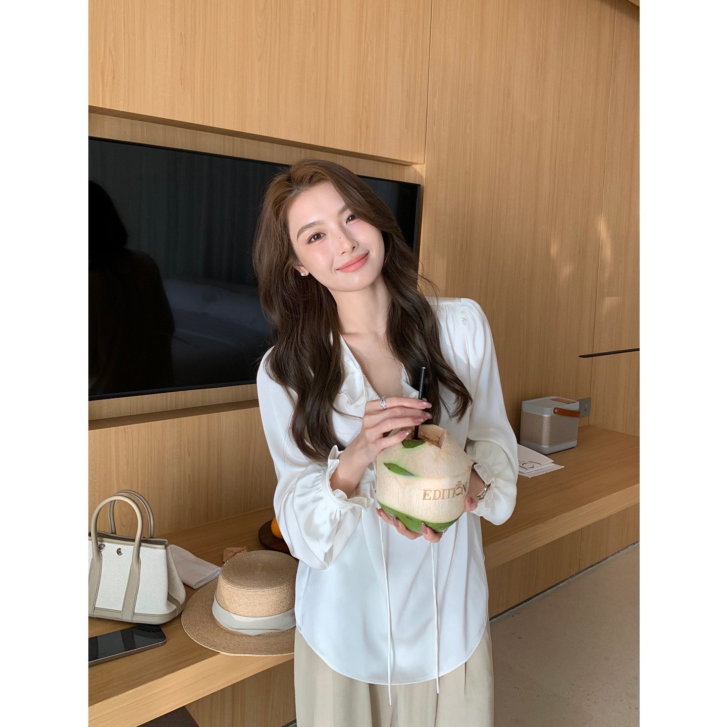 Lin 女宽松设计感系带长袖 温柔满溢 荷叶边v领衬衫 衬衣 法式 Maven