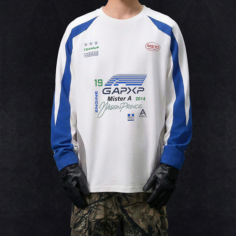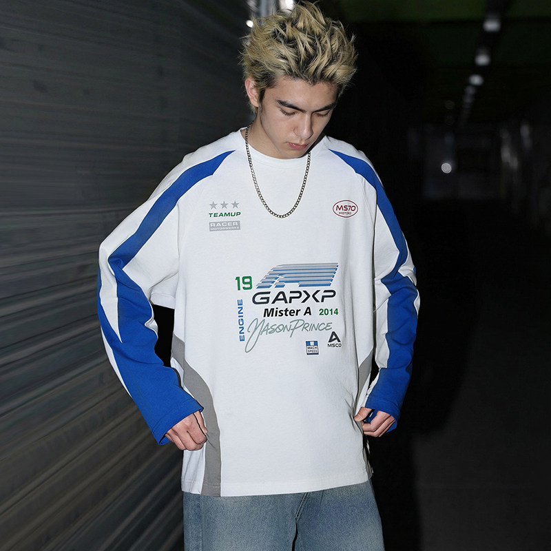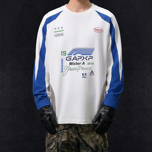 上衣纯棉打底衫 T恤撞色插肩袖 春 F1狂飙飞车竞速蓝赛车长袖 MRA男装