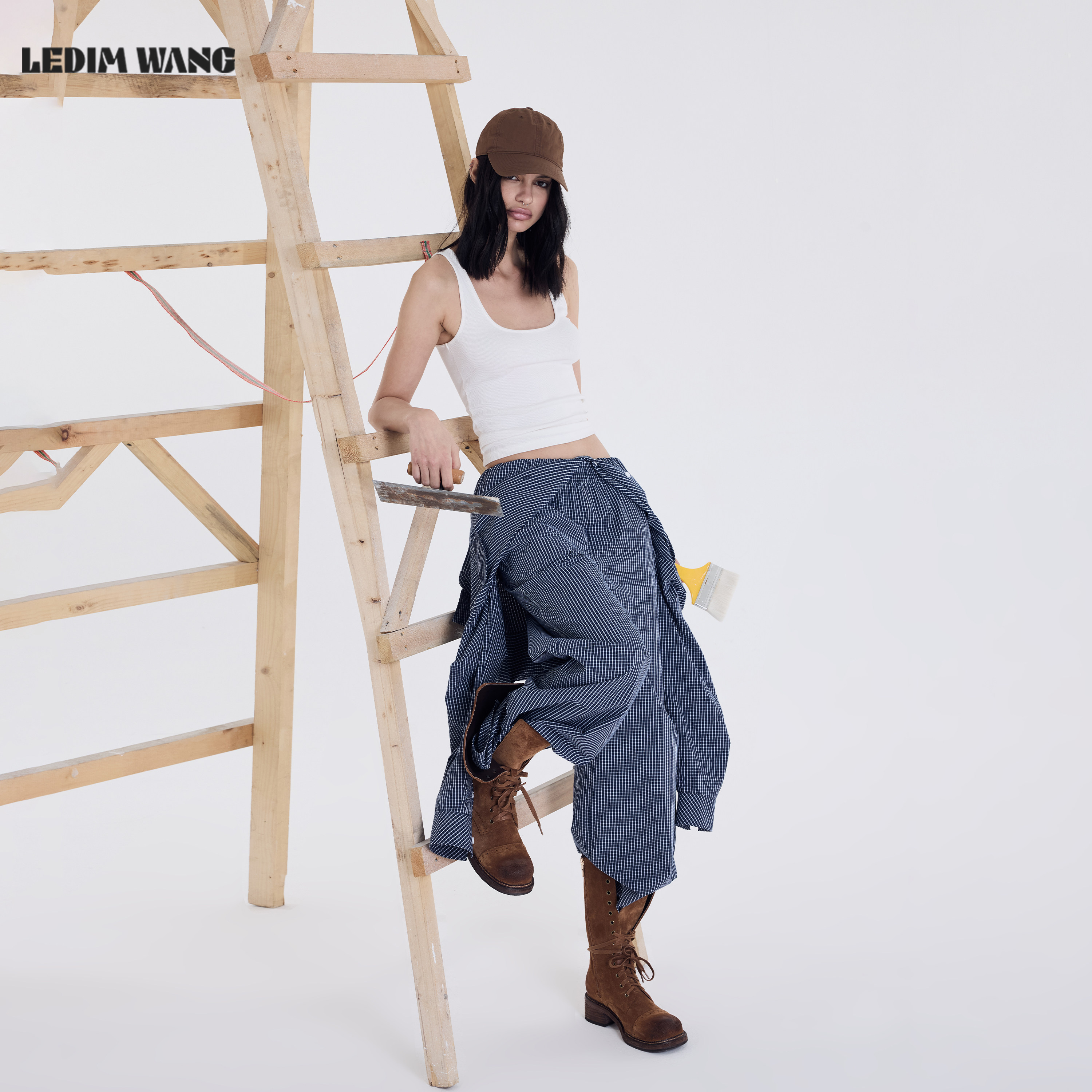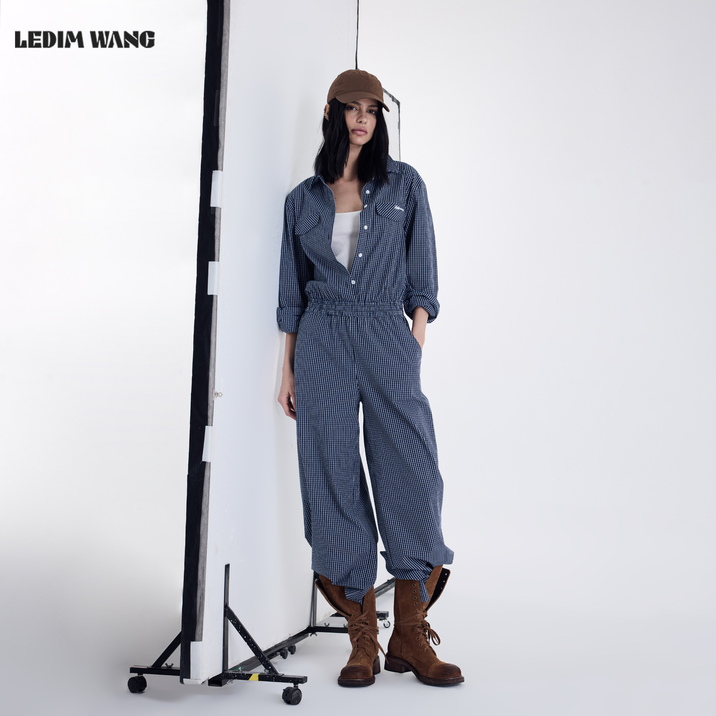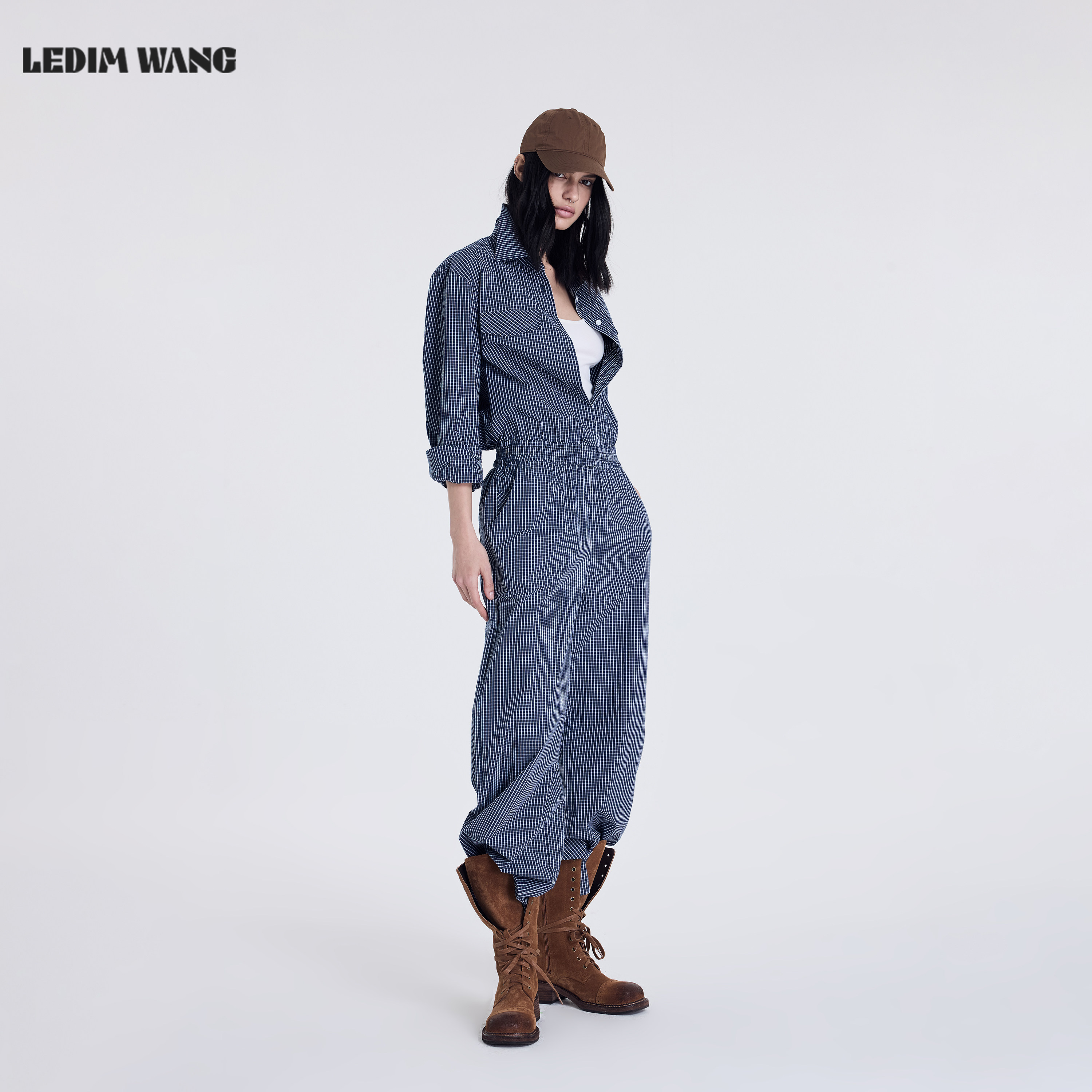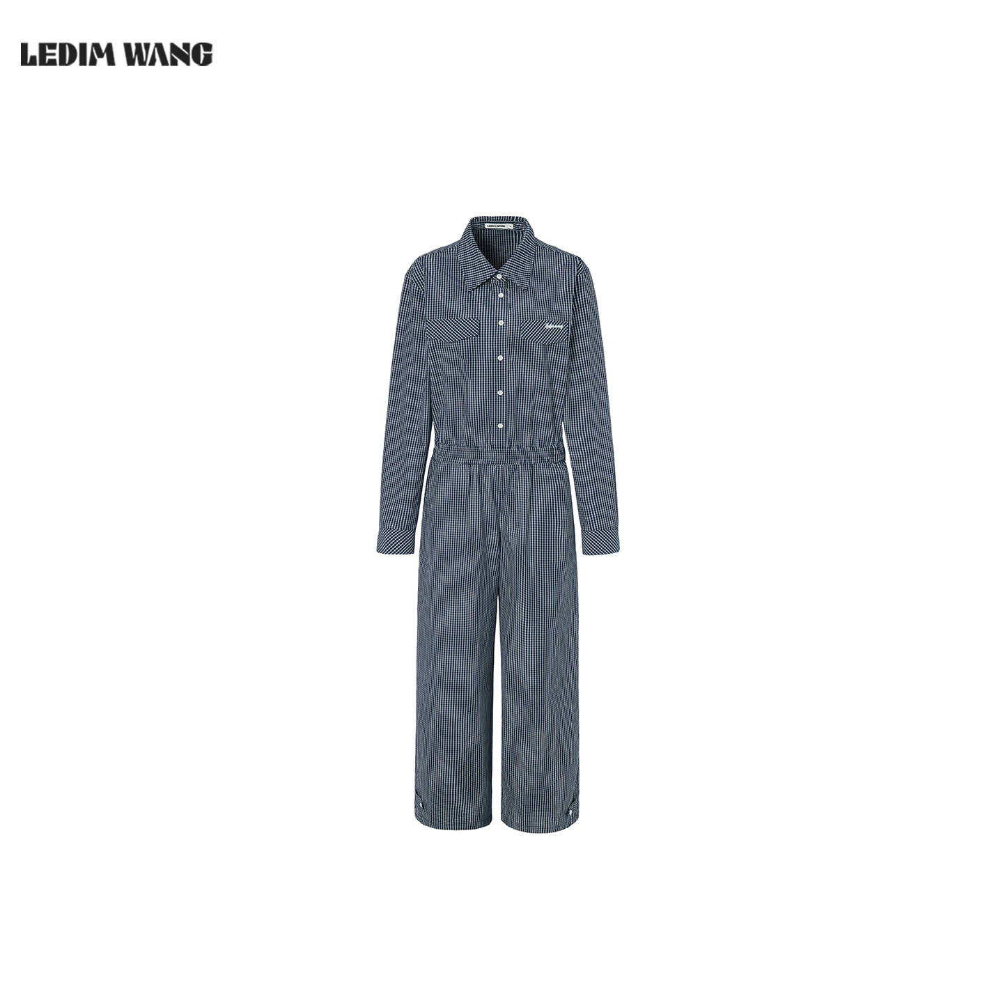百搭通勤休闲阔腿裤 LEDIM 女2026春夏新款 连体裤 WANG蓝色格纹工装
