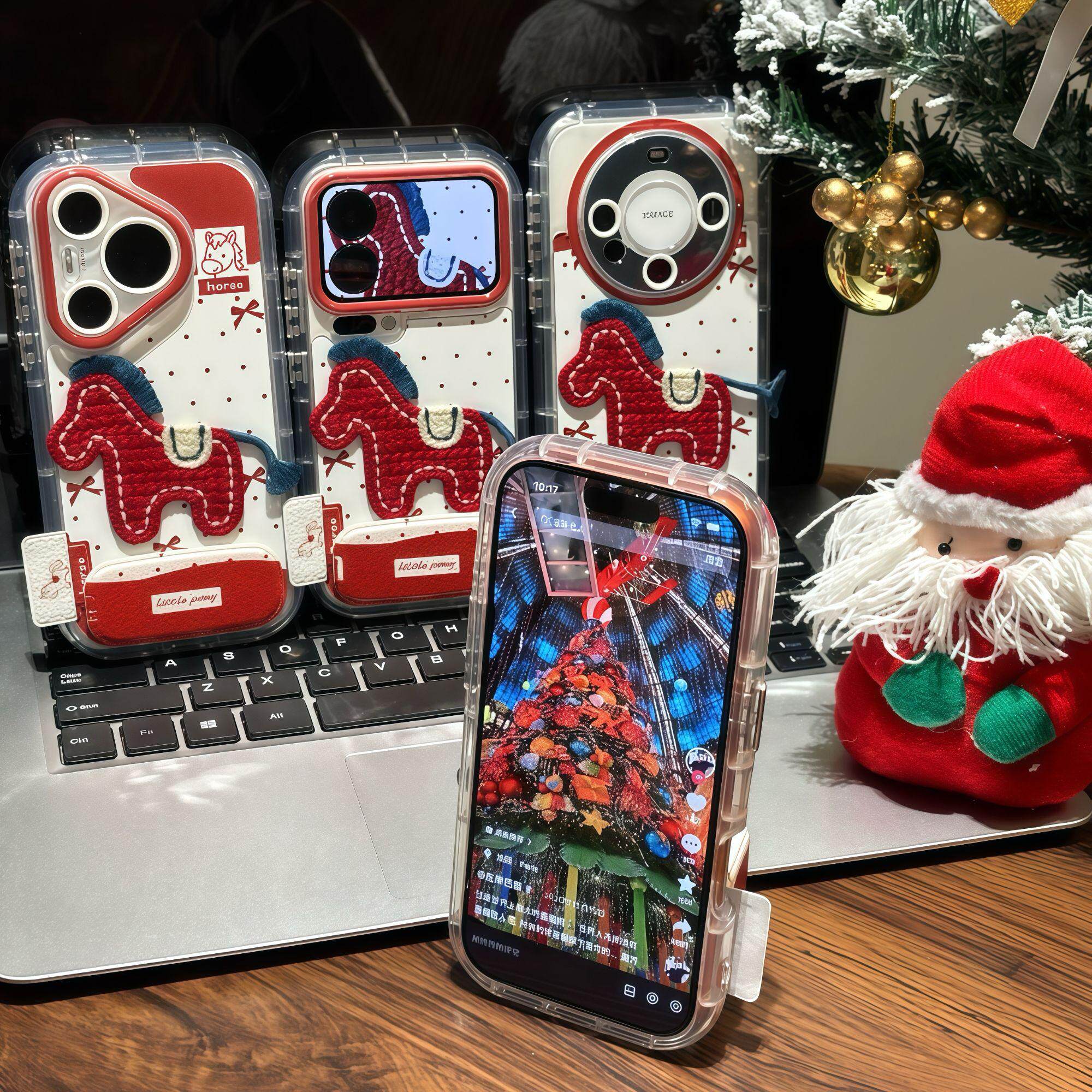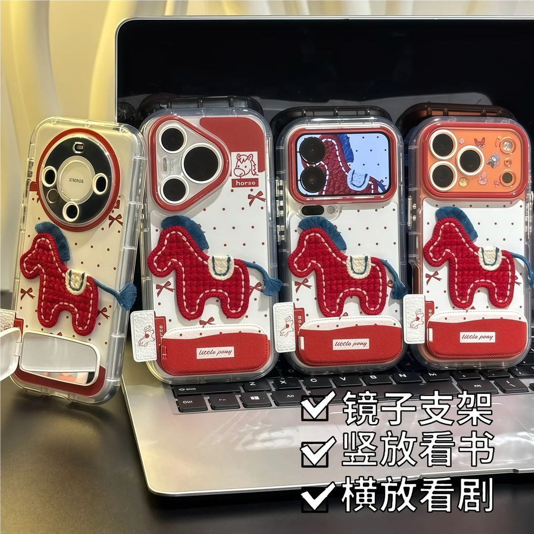 苹果17 80新款 16可爱vivox300全包findX9壳 14ins风红米K90 适用小米17promax新年刺绣小马支架手机壳小米15