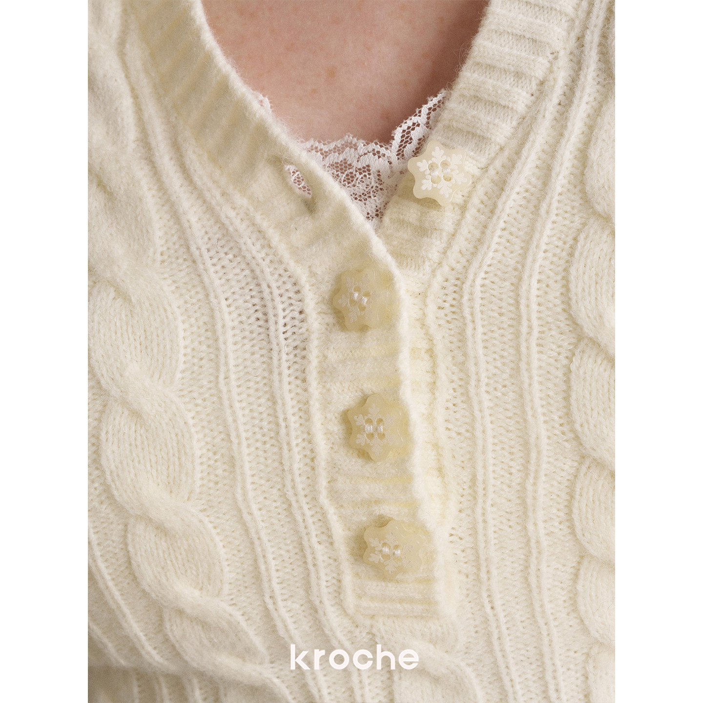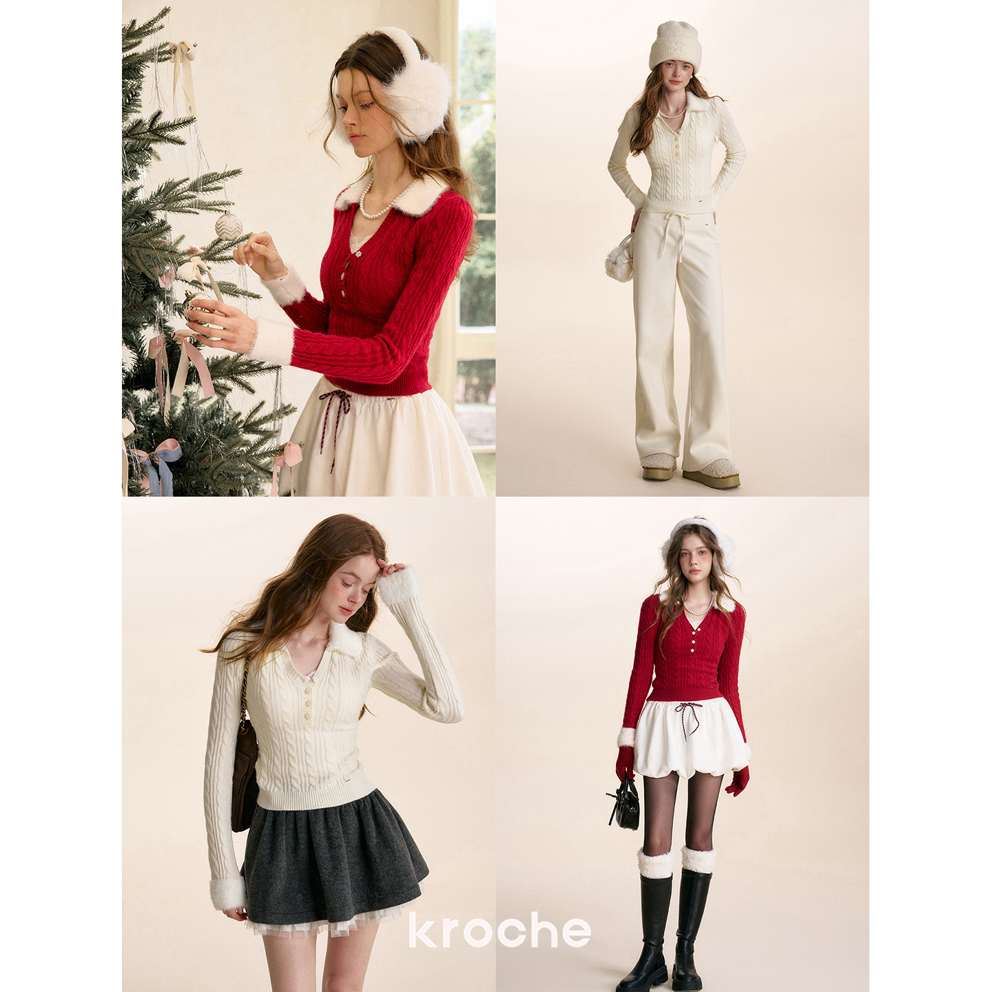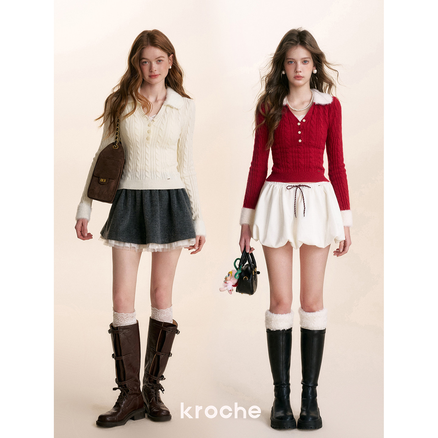 25aw 针织衫 云端软绒 毛绒拼接翻领麻花纹长袖 定制雪花扣 Kroche