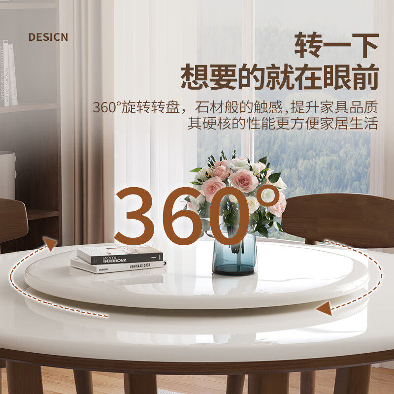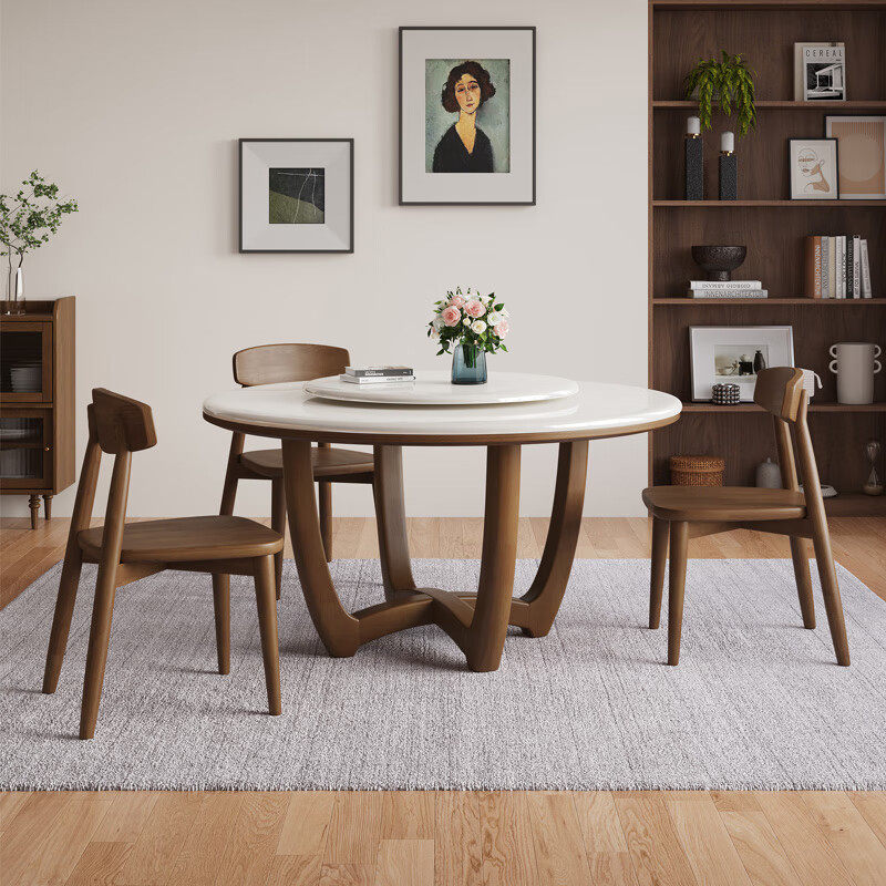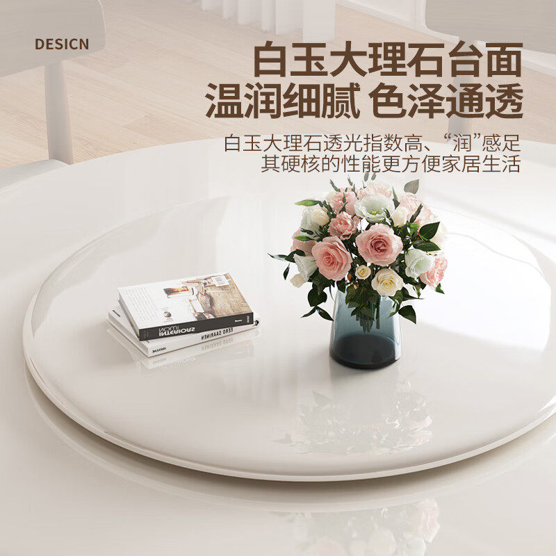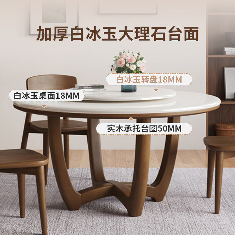 白冰玉大理石圆形餐桌带转盘新款 北欧现代实木中古风家用圆桌饭桌