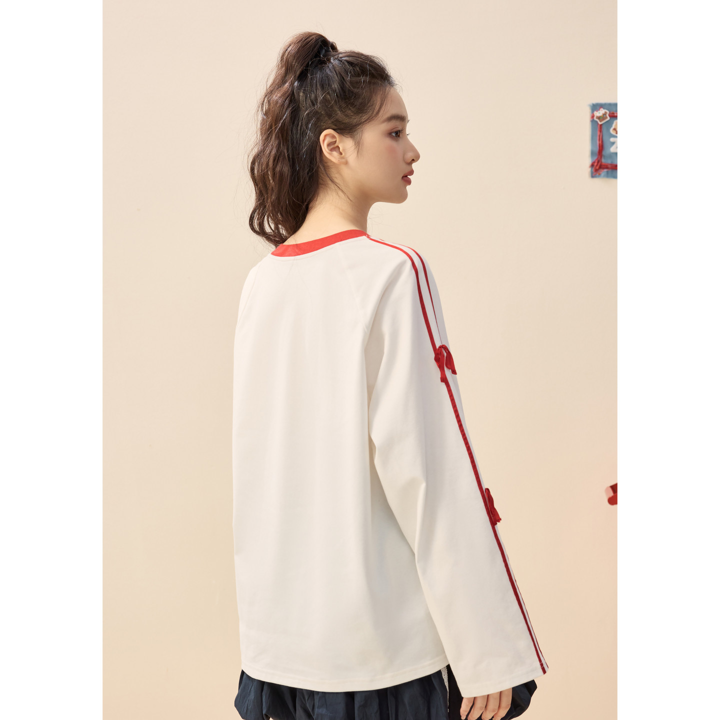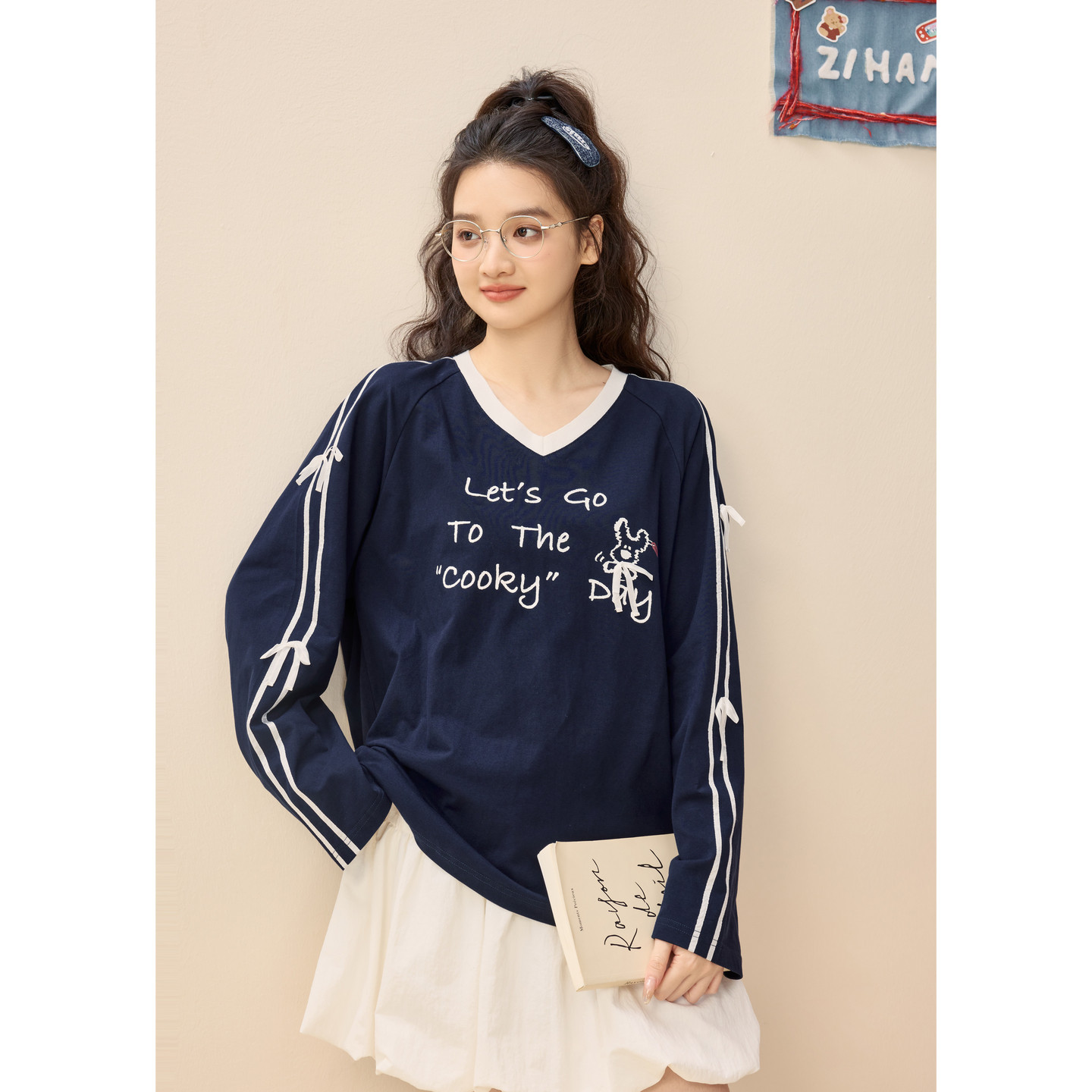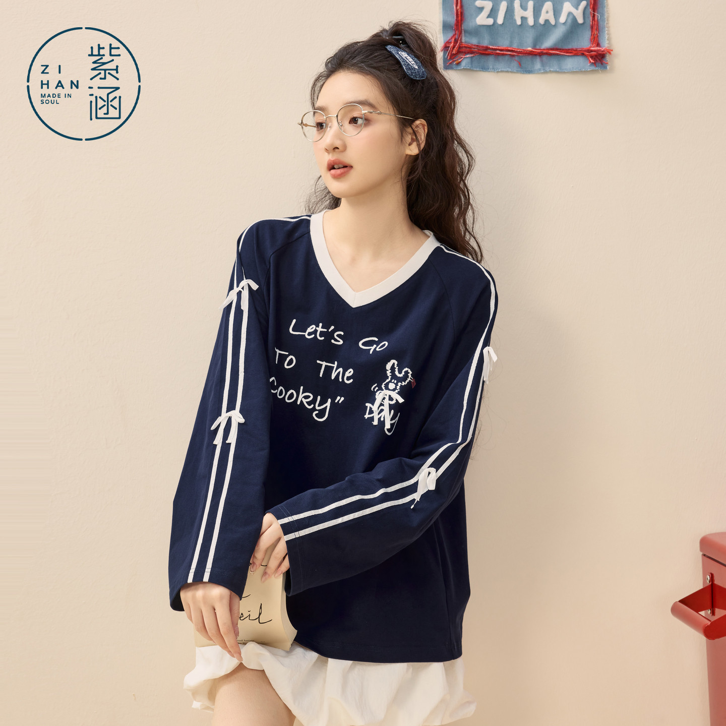 撞色印花条纹蝴蝶结设计宽松上衣 新款 紫涵v领长袖 T恤女2026年春季
