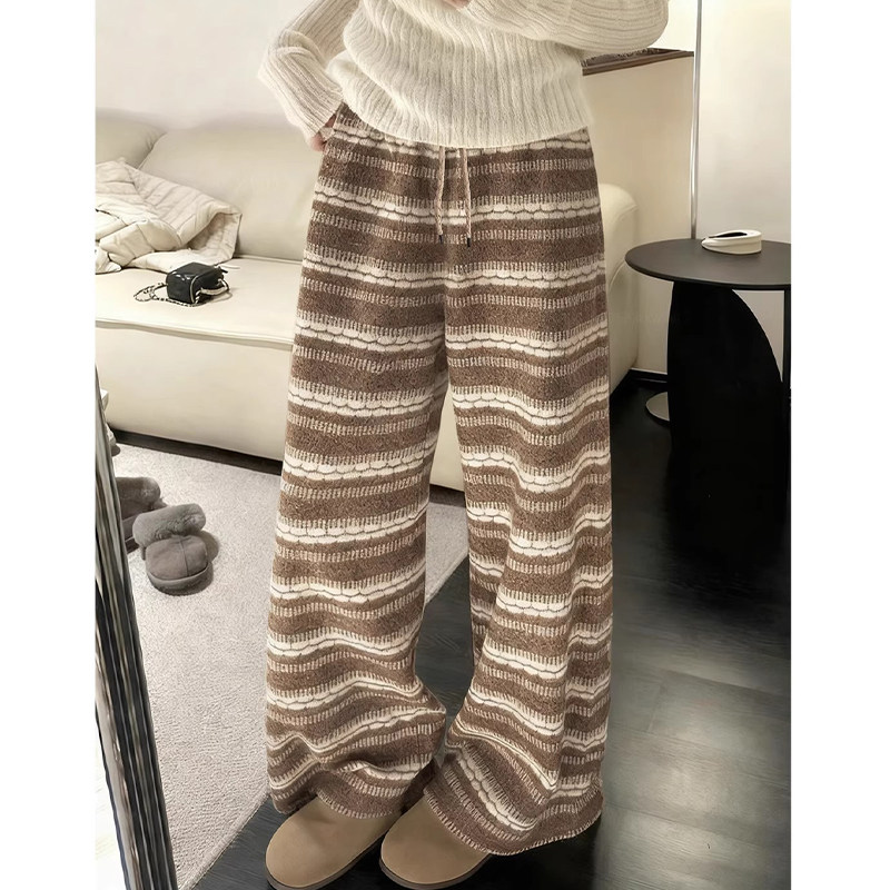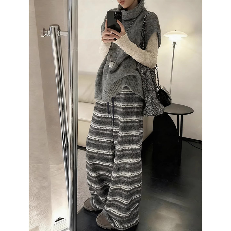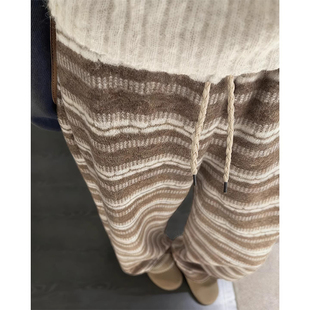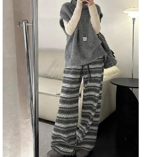 秋冬宽松加绒毛呢休闲条纹裤 灰色费尔岛提花针织阔腿裤 女2025新款