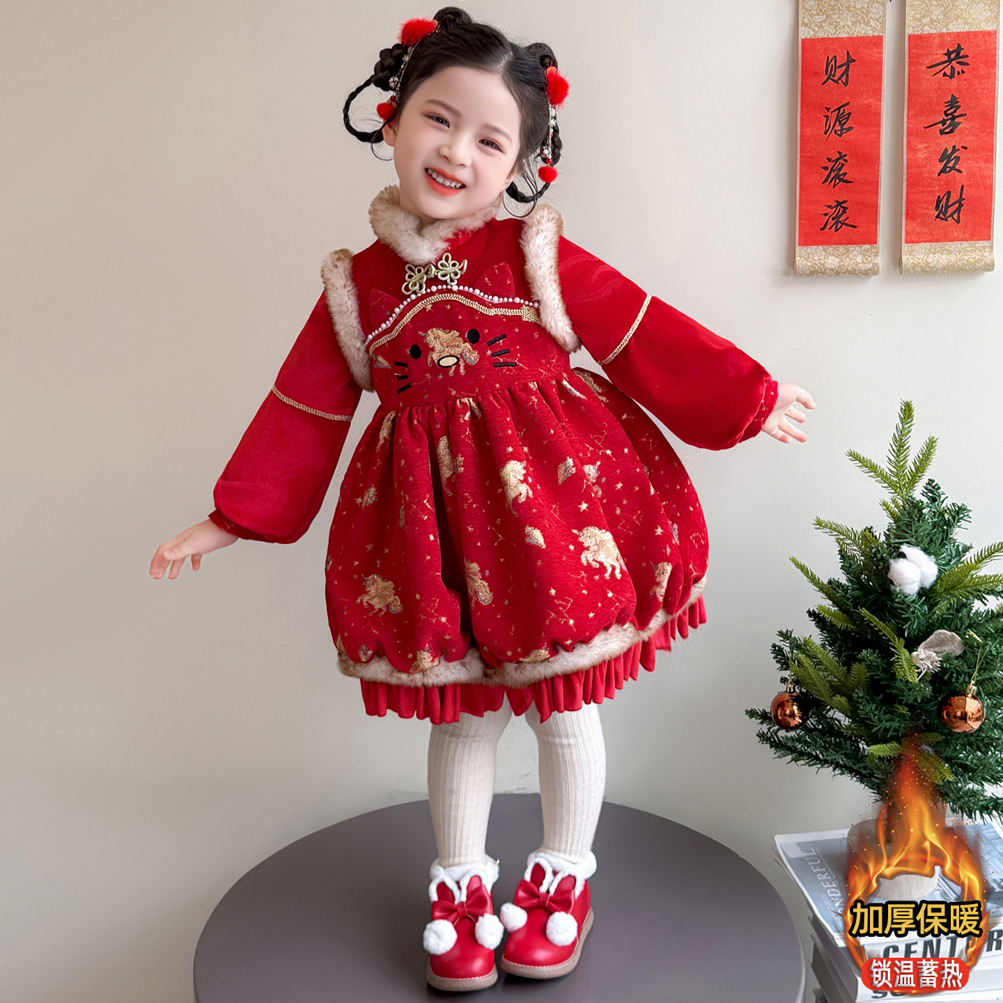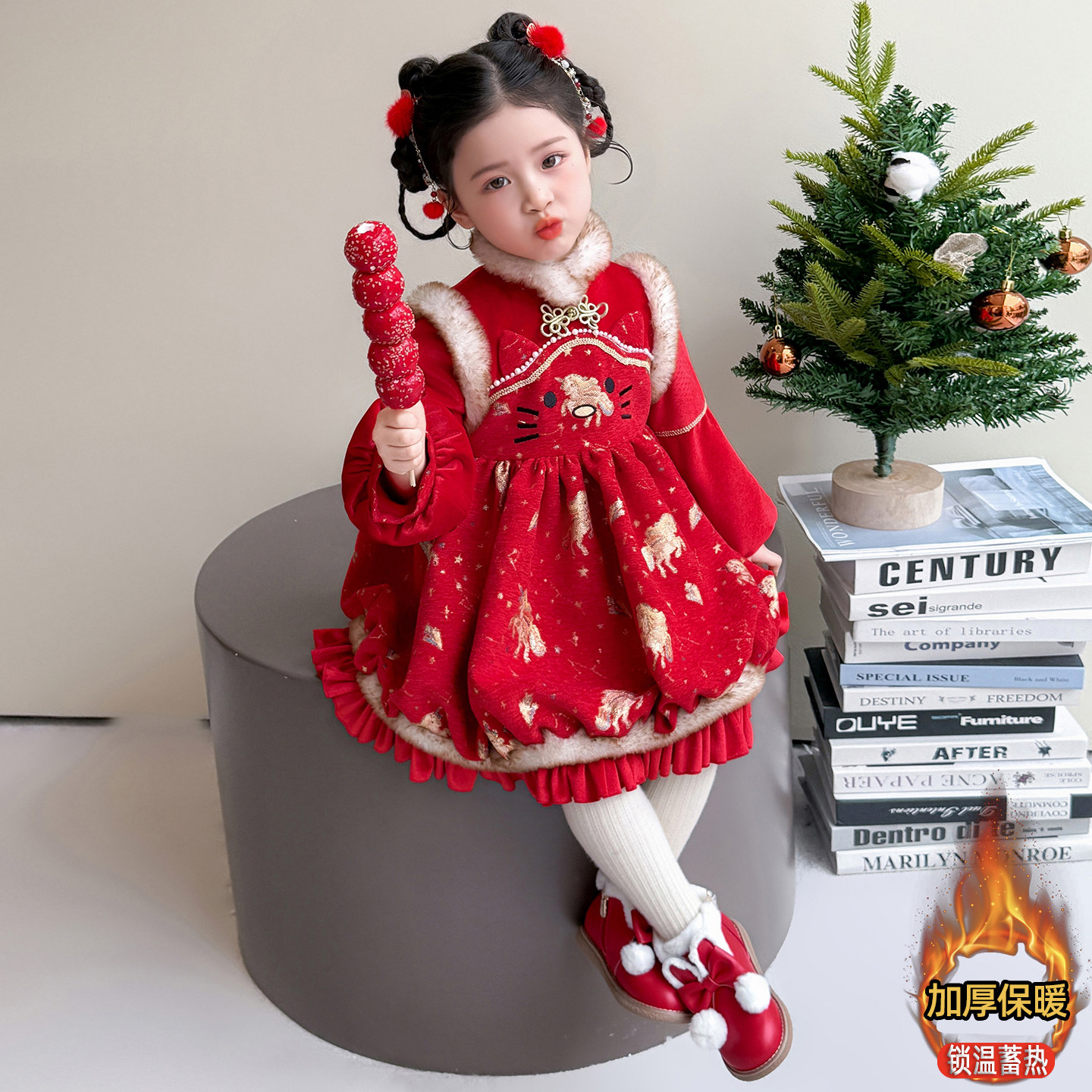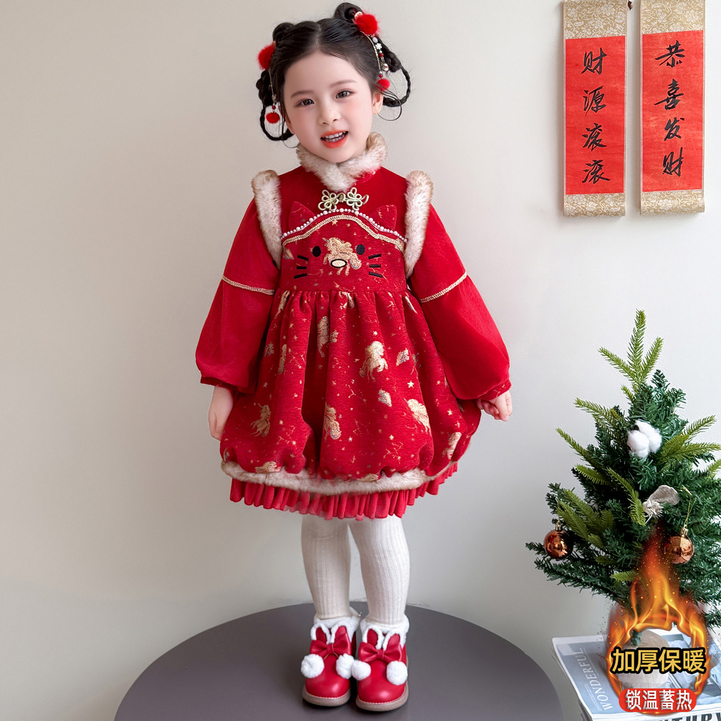 女童连衣裙加绒儿童秋冬季 拜年服过年小马新年红色女宝宝裙子冬装