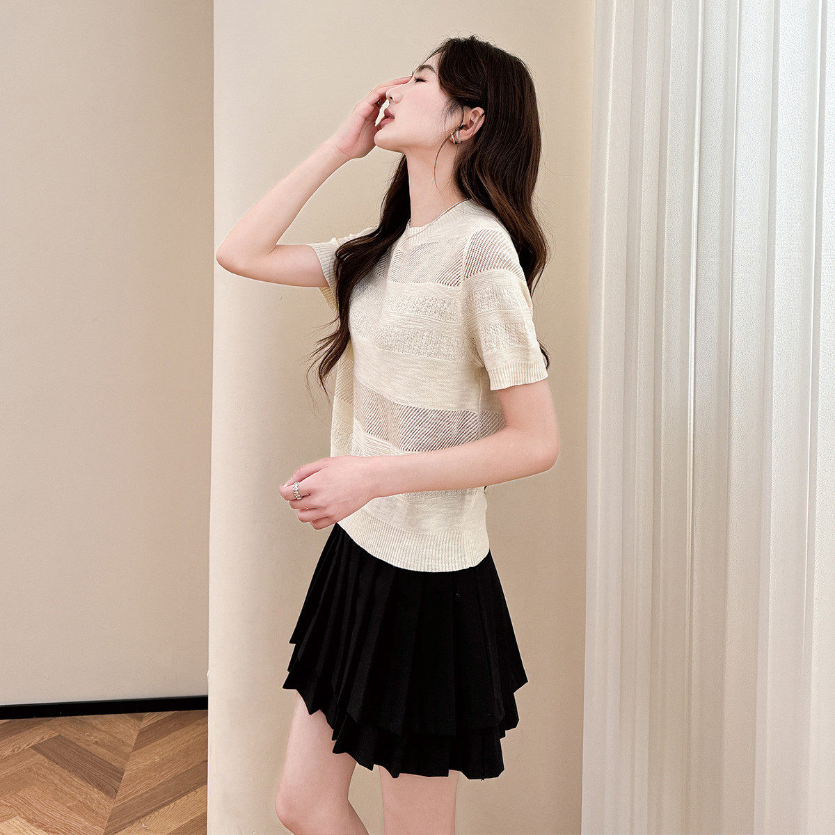 镂空设计感气质简约短袖 唐狮夏季 女圆领时尚 毛线衫 上衣女W 新款