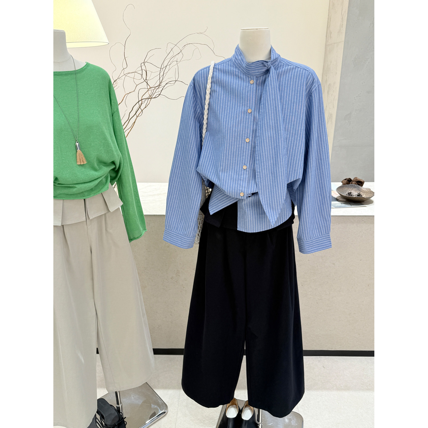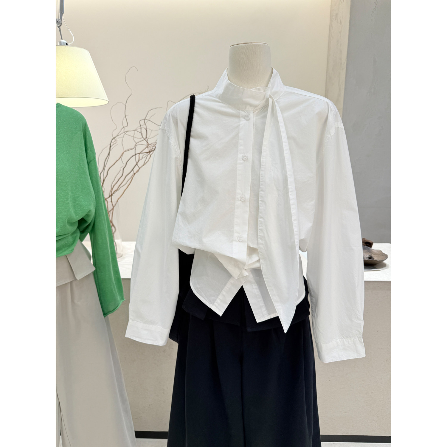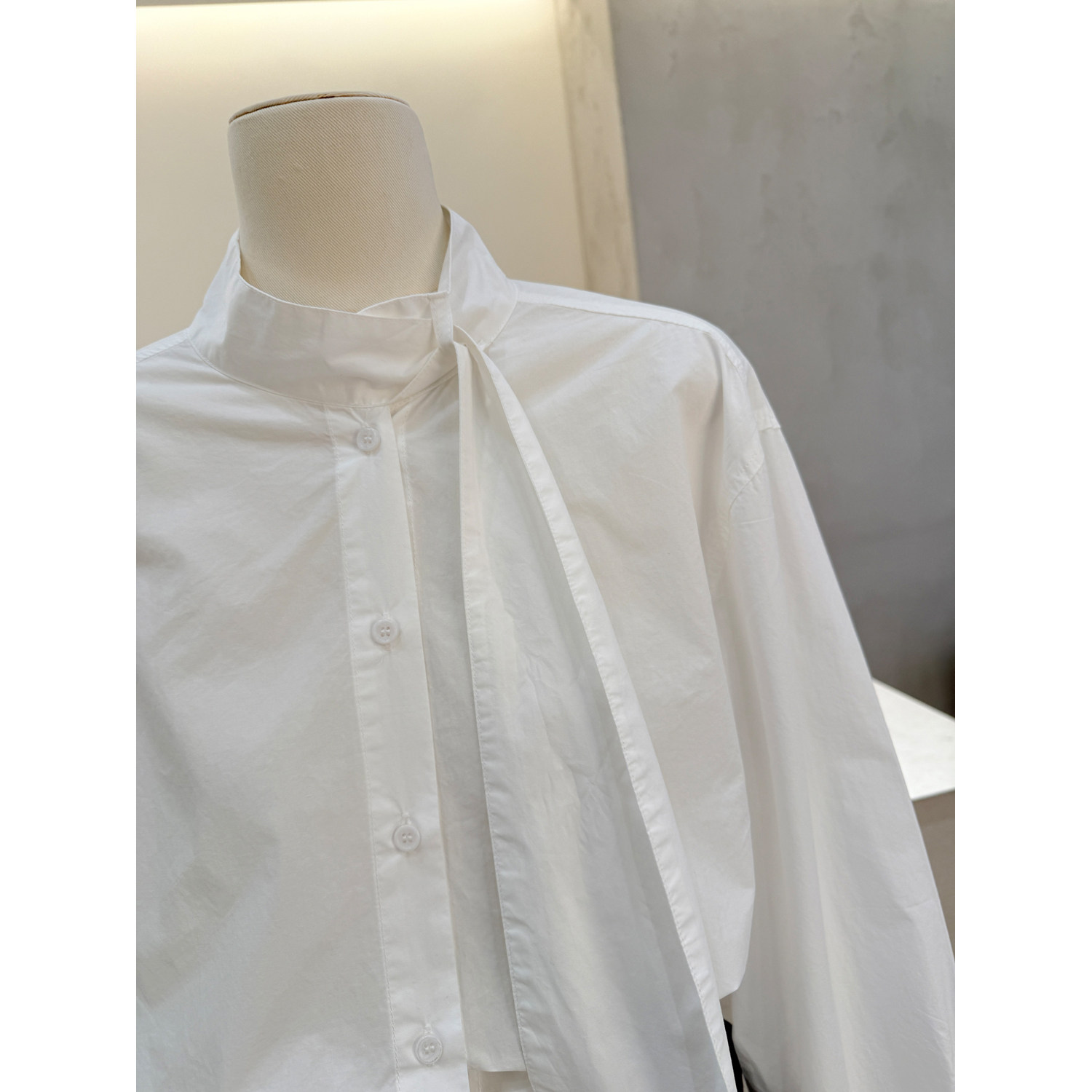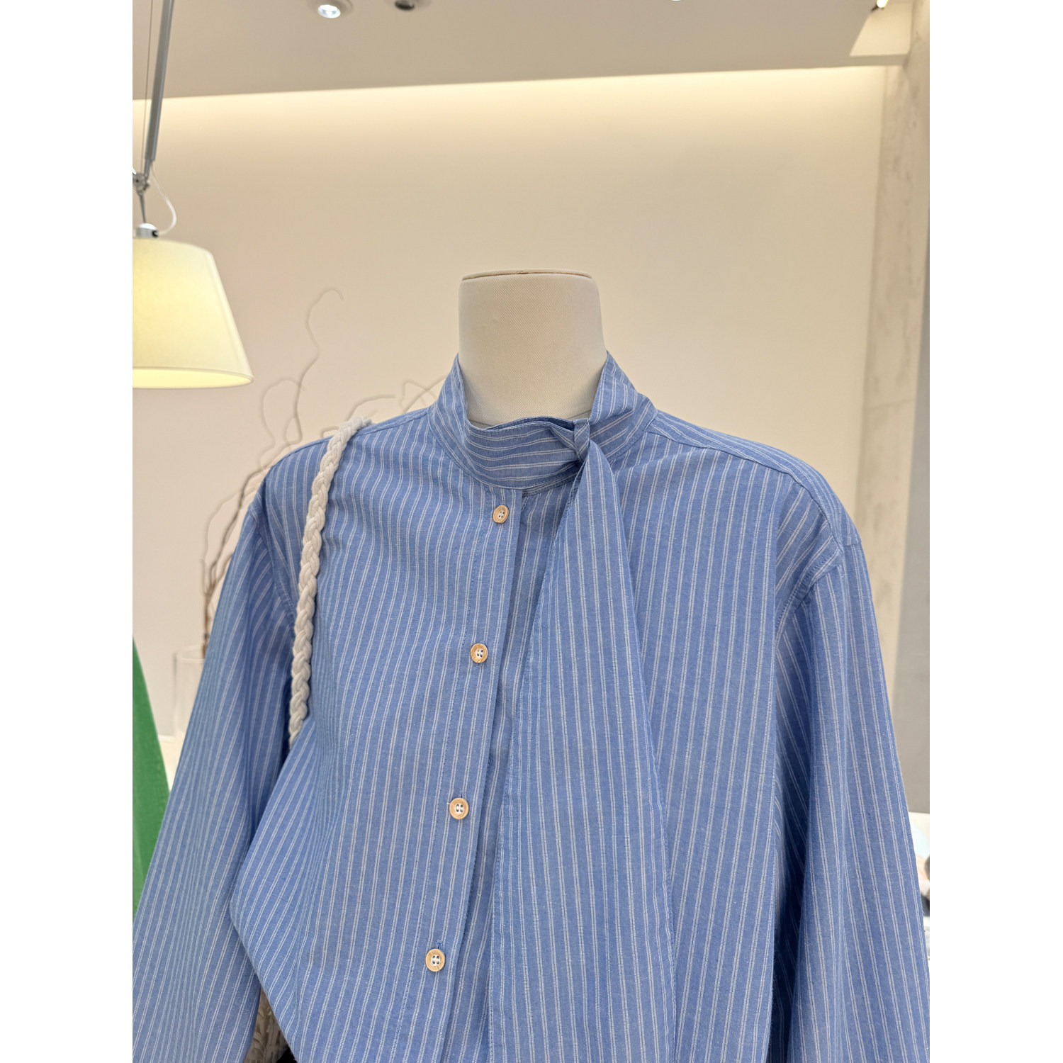 女宽松气质高级感长袖 设计感飘带立领竖条纹衬衫 衬衣 韩版 小哲