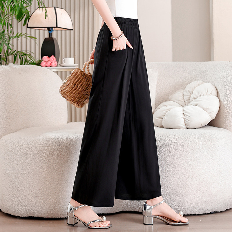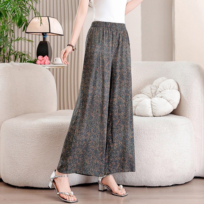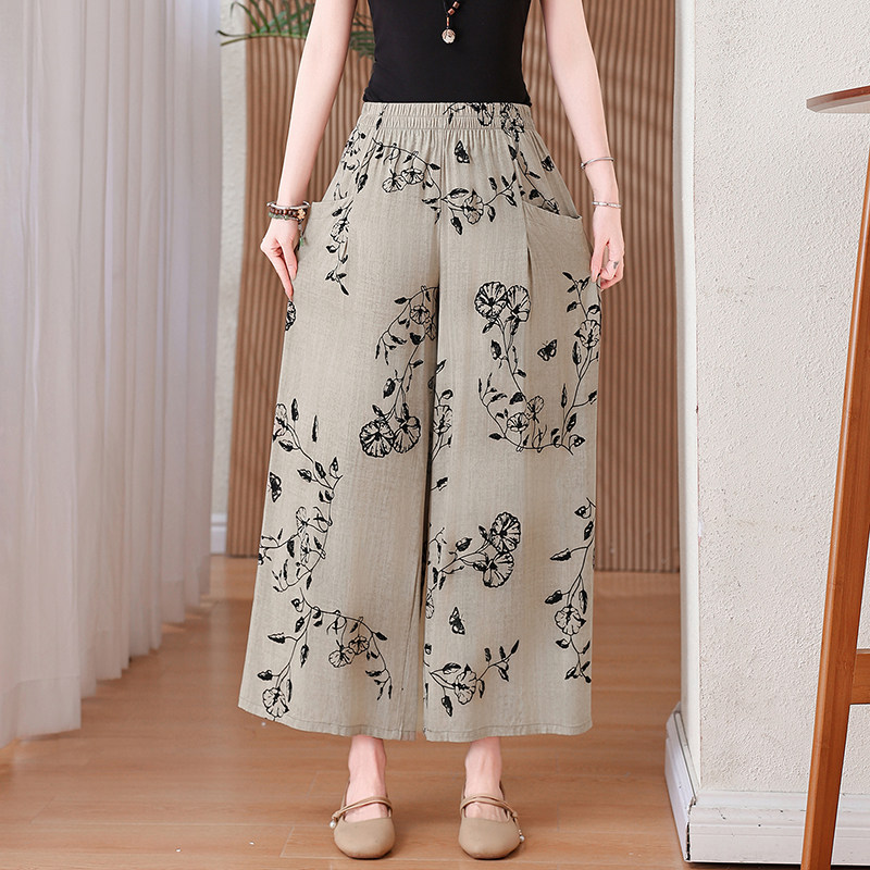 新款 休闲裤 棉绸九分裤 中年妈妈碎花显瘦阔腿裤 女松紧高腰裙裤 夏季
