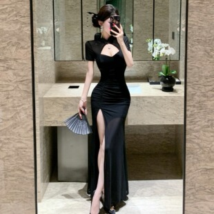 旗袍连衣裙女技师服 显瘦包臀开叉短袖 新中式 复古性感镂空露胸修身