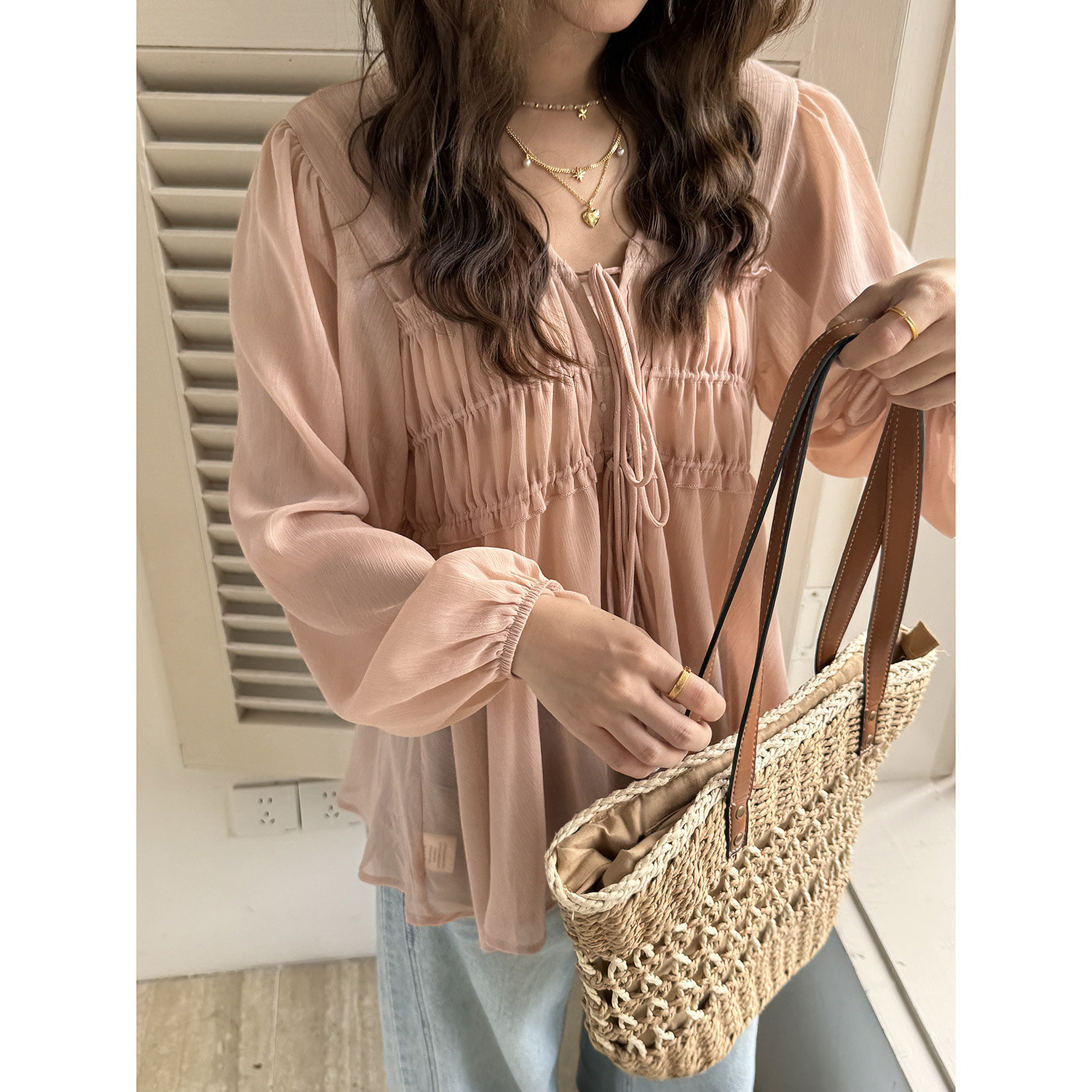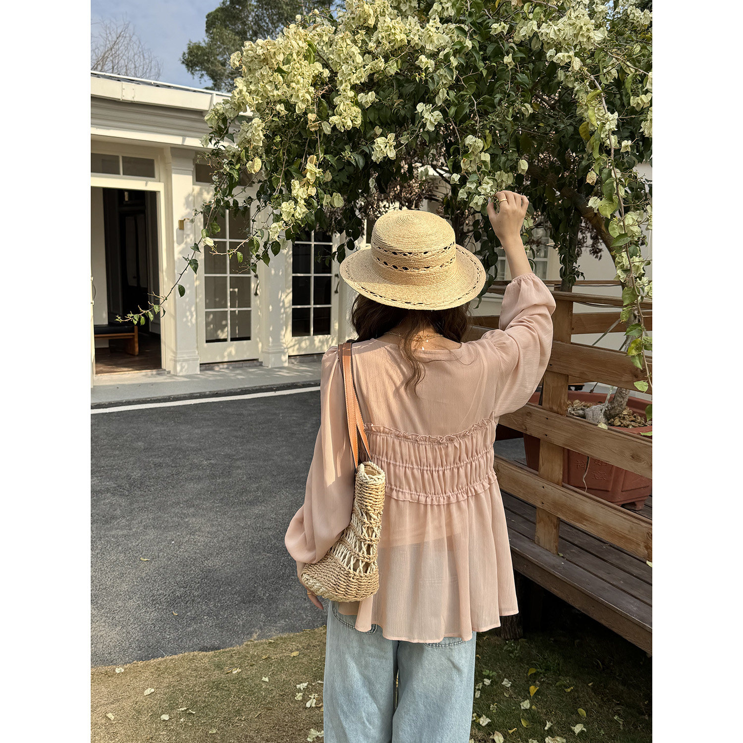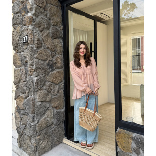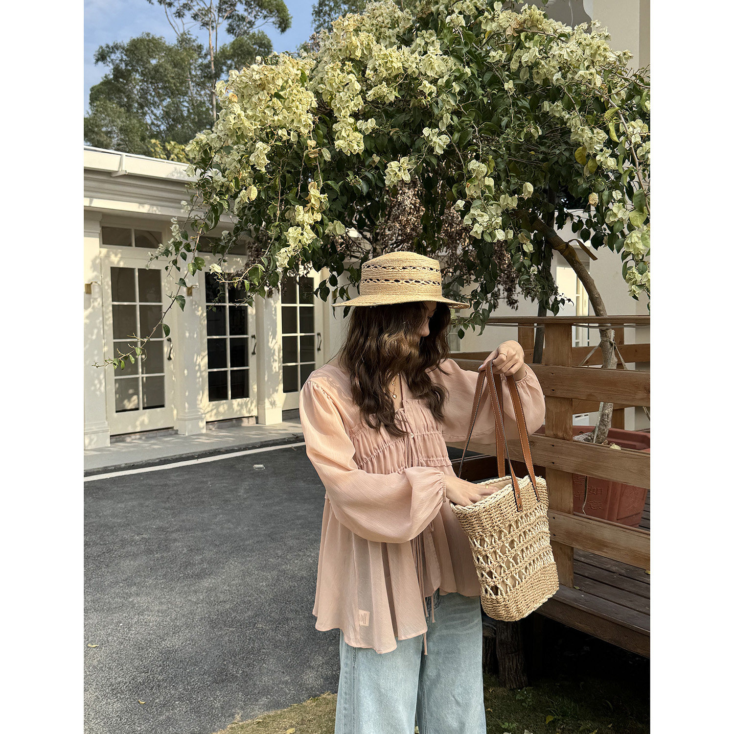 度假设计感春夏季 吴宝珠 V领衬衫 粉色木耳边上衣女甜美雪纺衫 法式