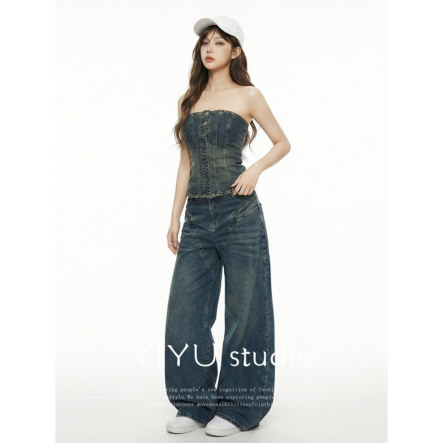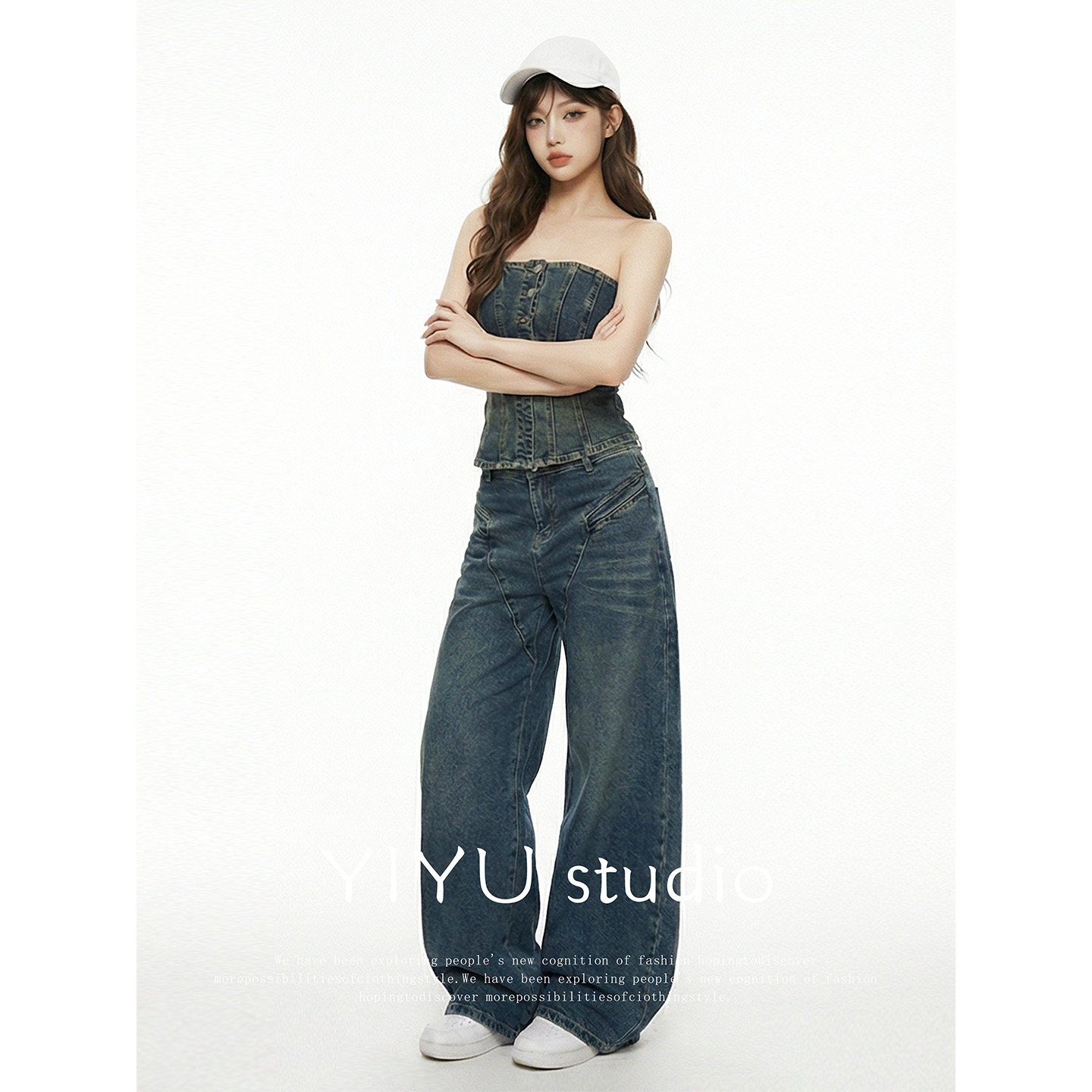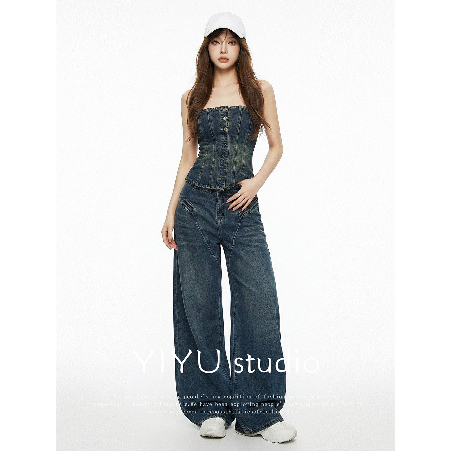 伊予YiYu 时尚 美式 女2026春夏修身 辣妹两件套 复古牛仔抹胸套装