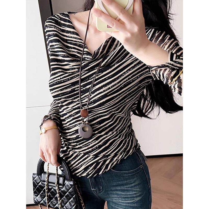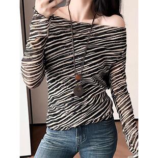 韩系设计感小众黑白条纹长袖 高级感百搭上衣 T恤女荡领洋气不撞款
