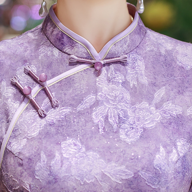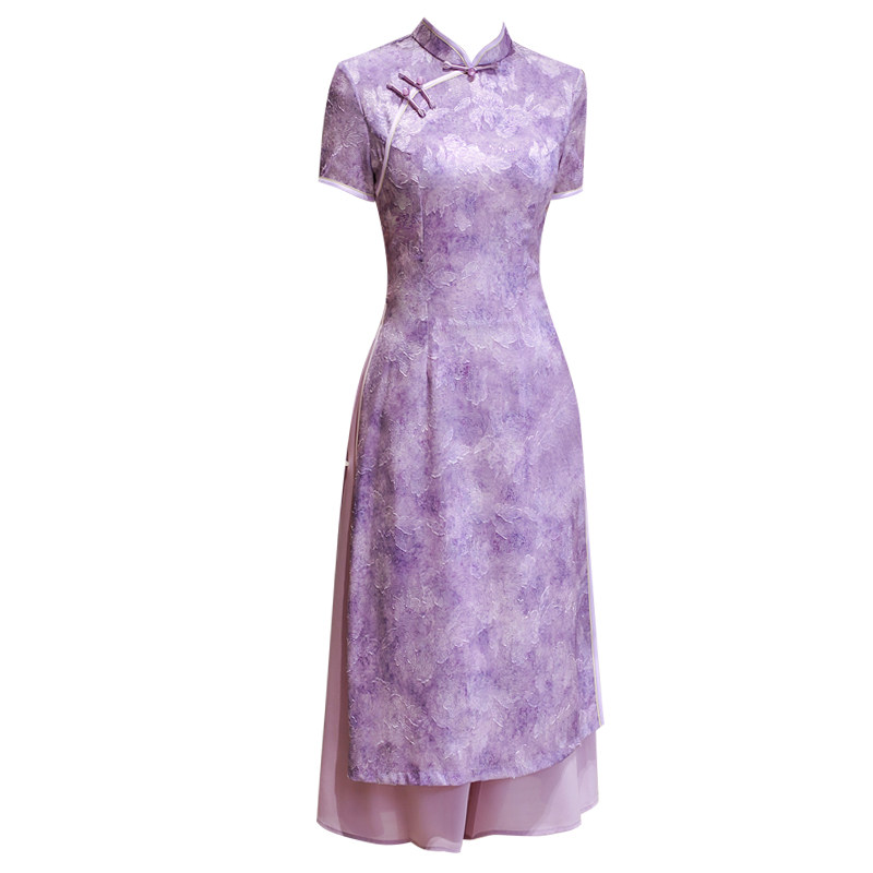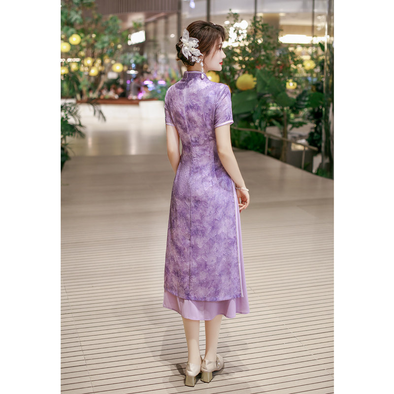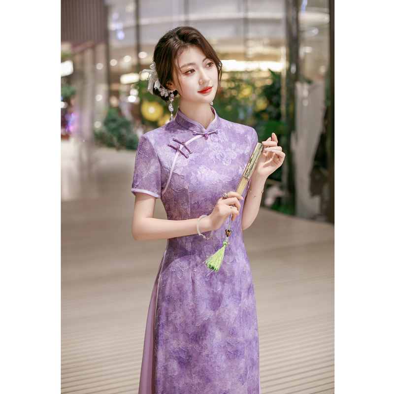 高考送考服 小个子妈妈女夏装 改良旗袍紫色奥黛连衣裙新中式 年轻款