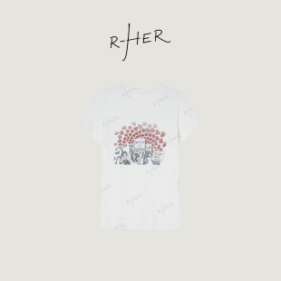 学院风刺绣短袖 怦然心动 打底上衣休闲内搭圆领落肩T恤女 HER