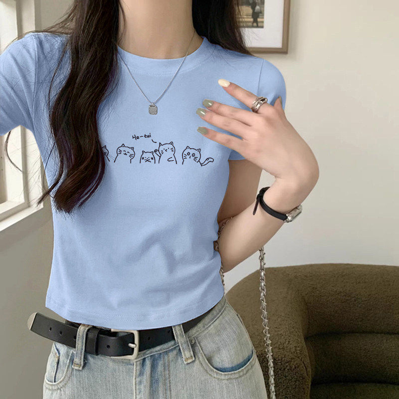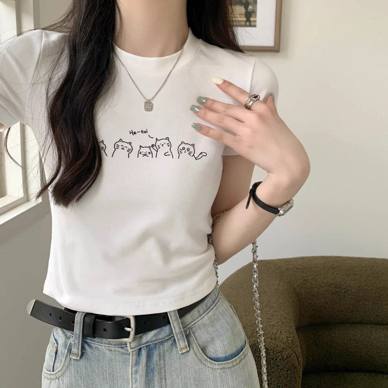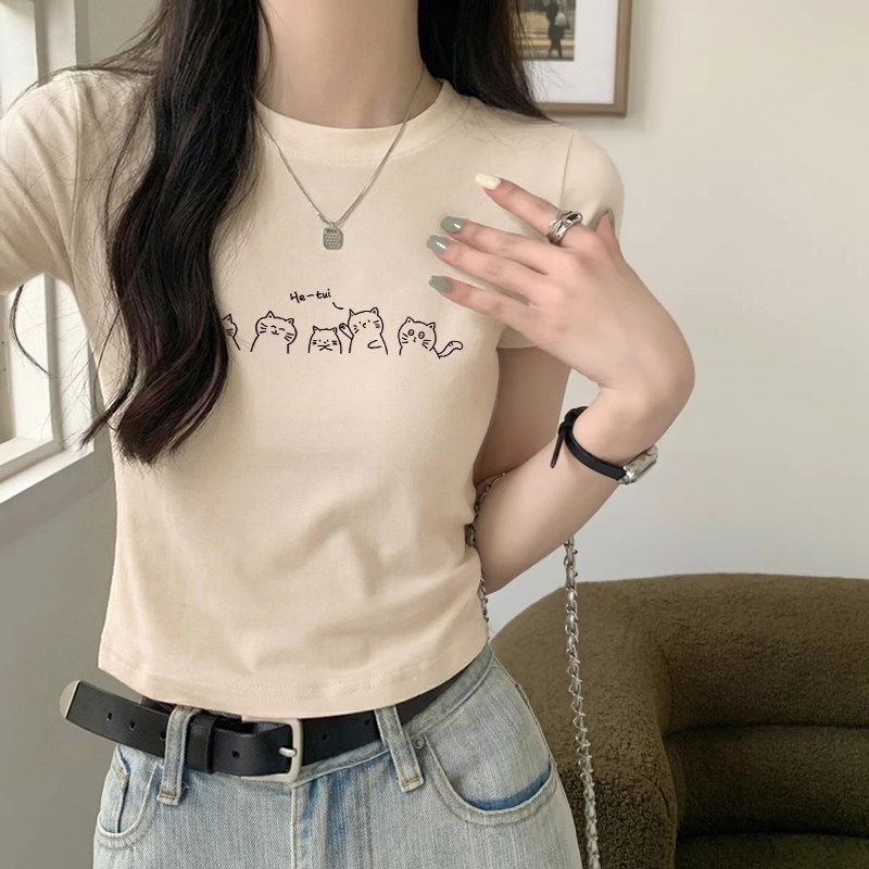 粉色圆领正肩短袖 多巴胺设计感纯棉高腰显瘦小上衣 T恤女2026夏季
