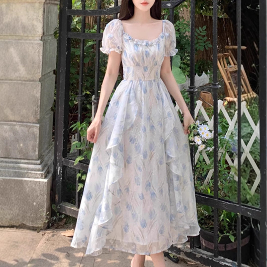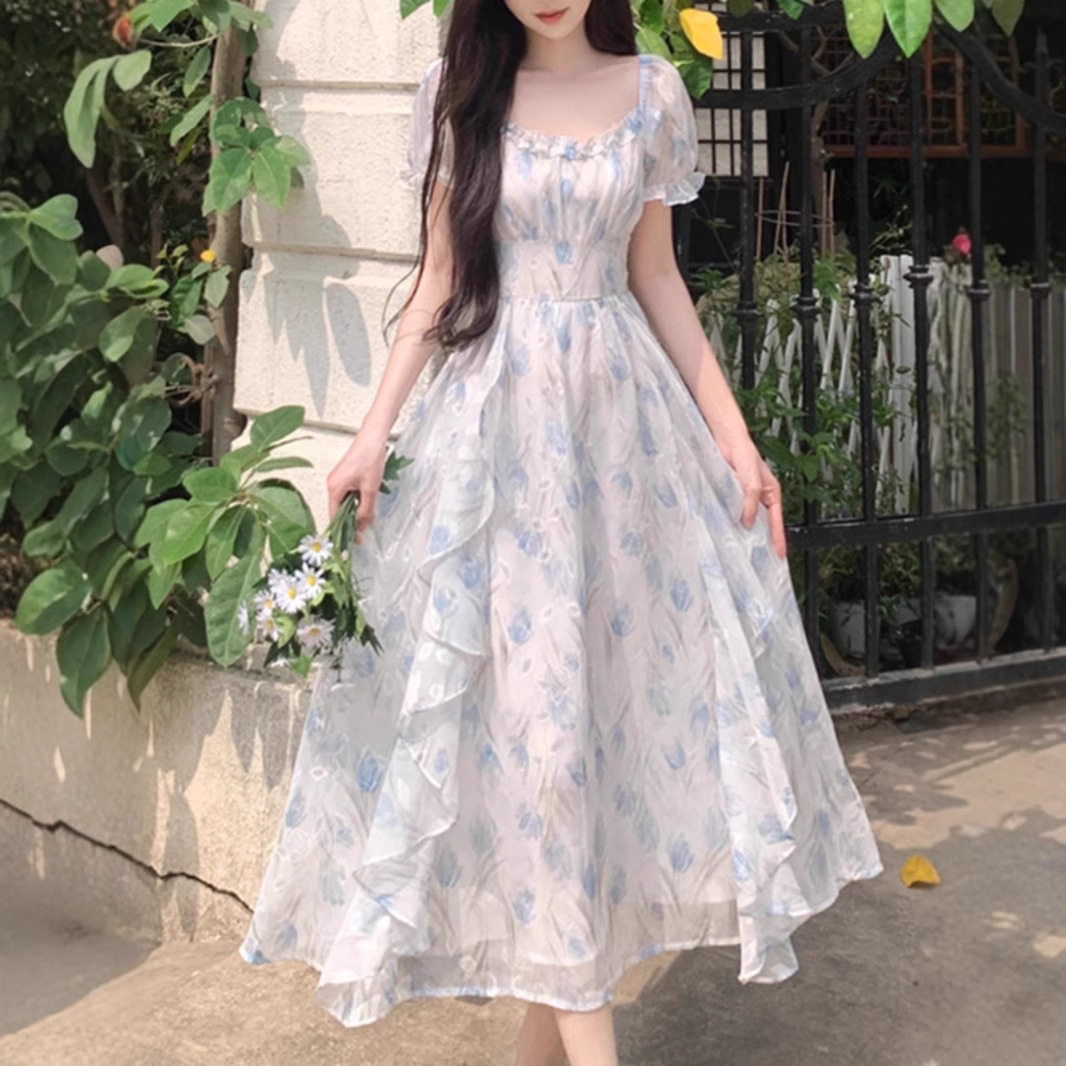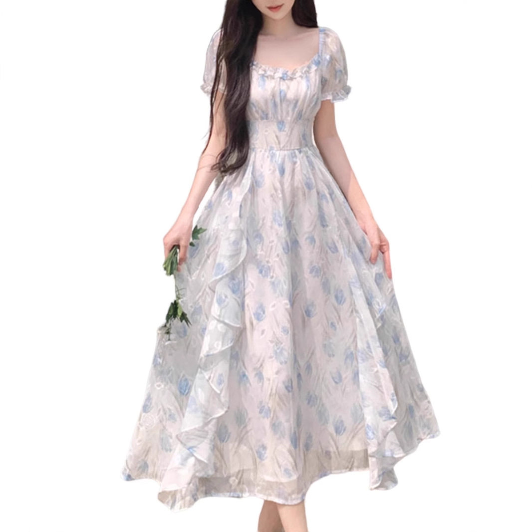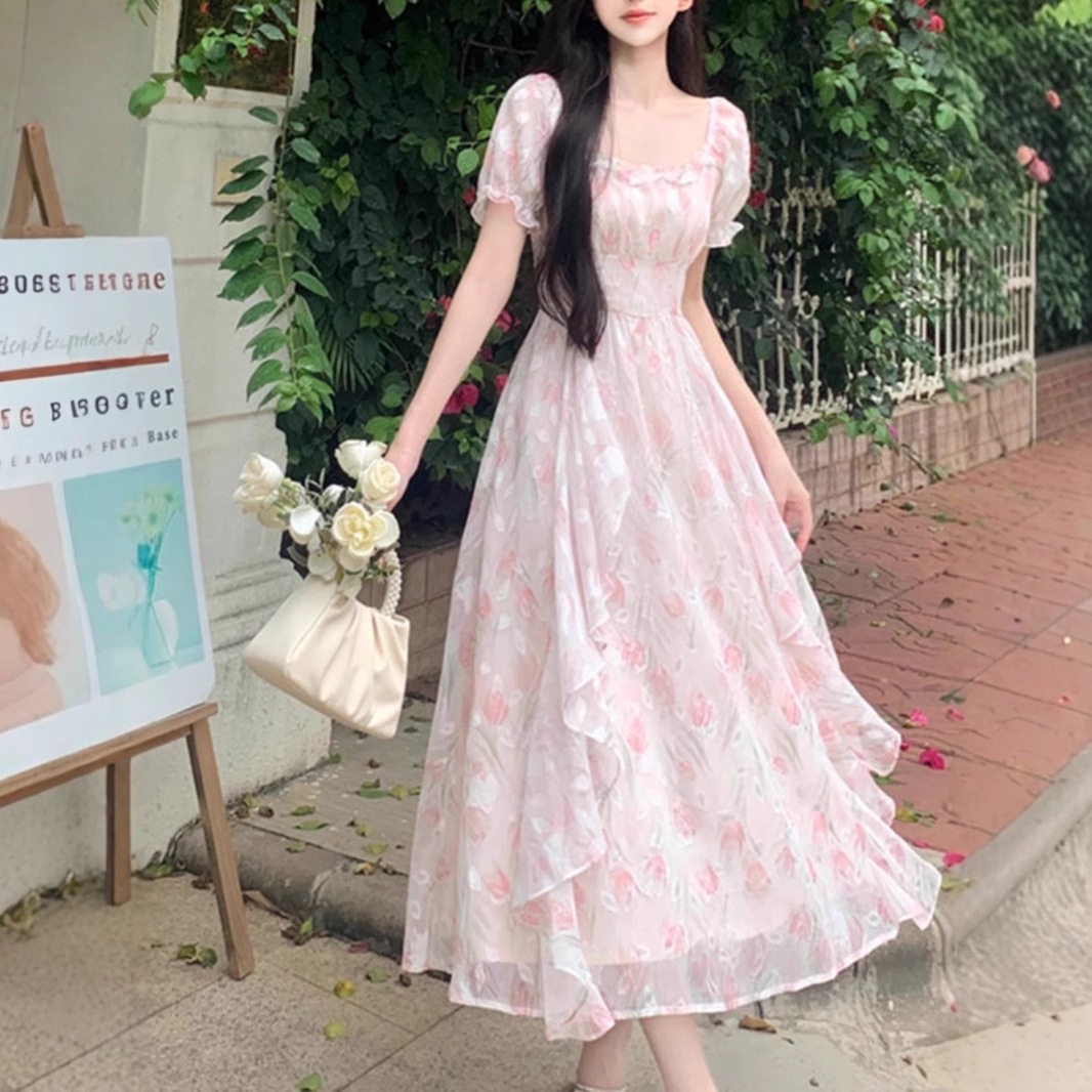 春秋方领浪漫碎花雪纺连衣裙女夏季 气质收腰显瘦仙女长裙 大码