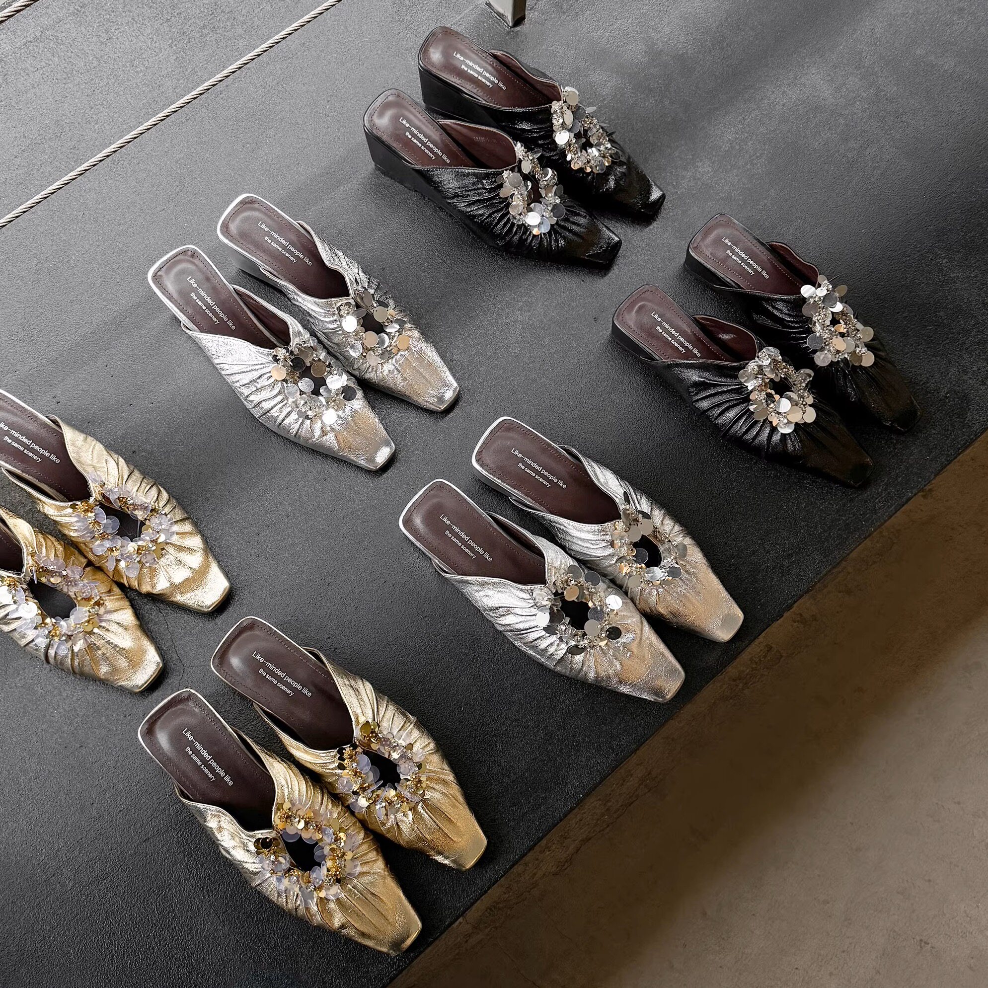 女 女坡跟外穿一字拖单鞋 轻奢优雅 Elegant牛皮真皮亮片包头半拖鞋