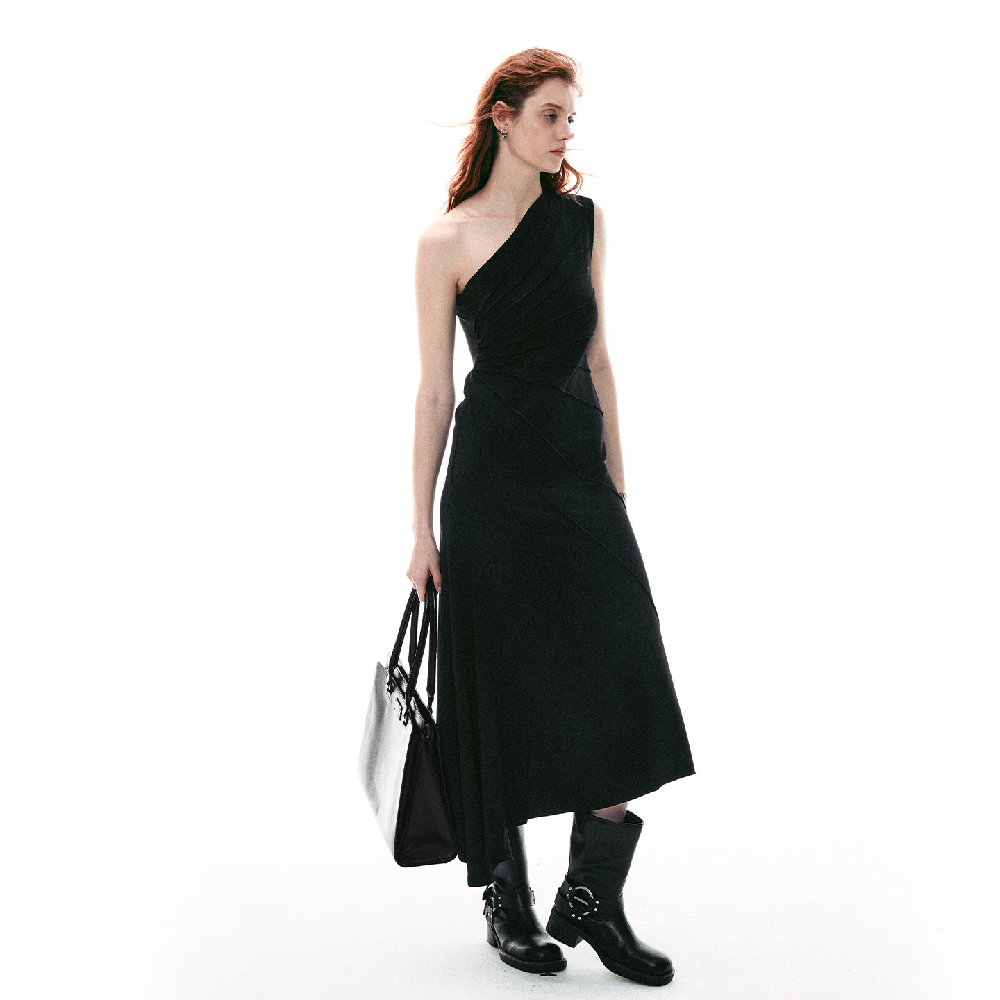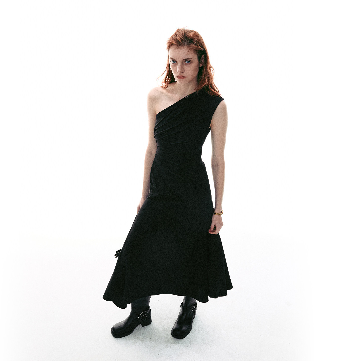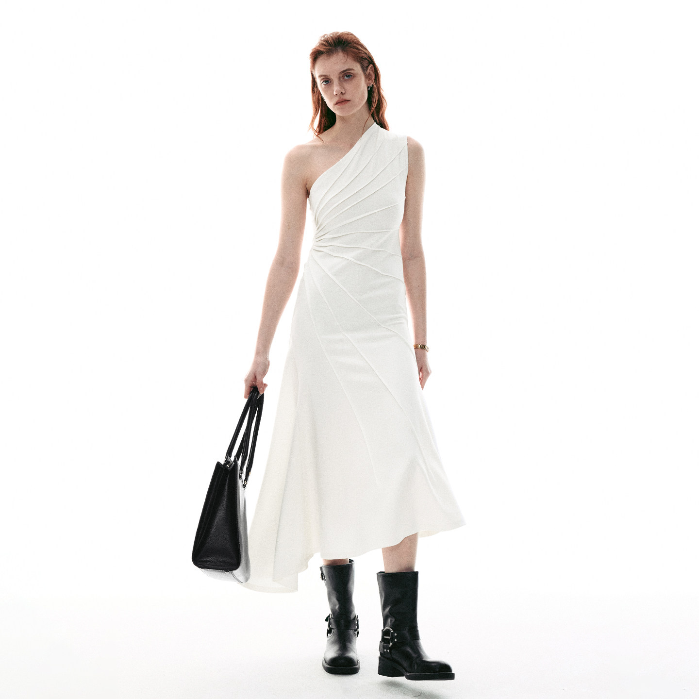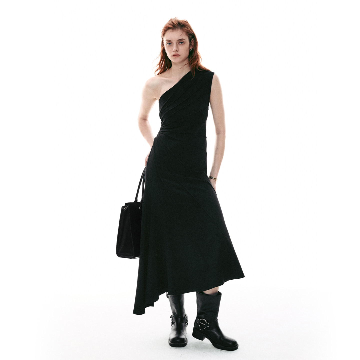 法式 26SS夏季 放射压褶斜肩针织背心不规则连衣裙女 MOMENT SINGLE