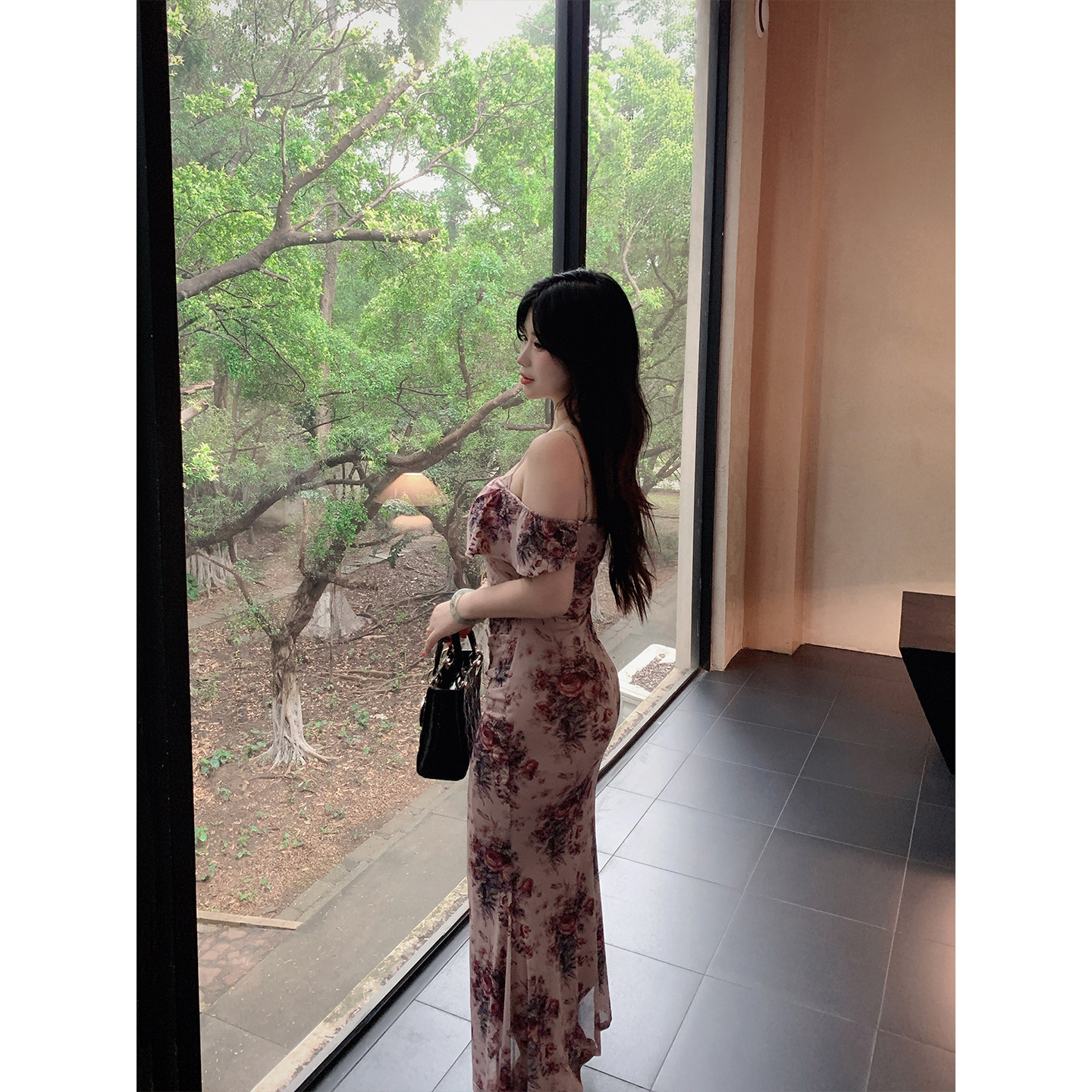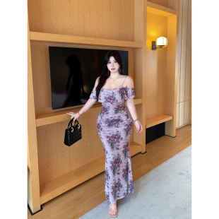 babes 网纱吊带连衣裙女长裙修身 南法风情 法式 包臀长裙 大码